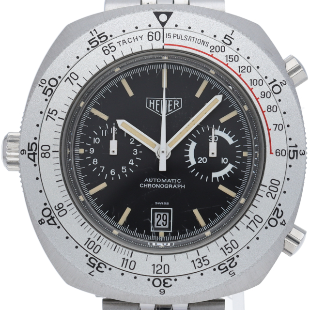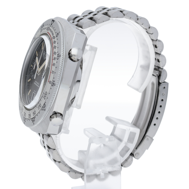 文字盤と完全に分離された回転計算尺が特徴のホイヤー・カリキュレーター。最近の「デカ厚」時計達の先祖のような圧倒的な存在感があります。ネイビー文字盤にオレンジを配色することで、複雑になりがちなクロノグラフの顔をすっきりと見せていると同時に、70年代的モダンテイストを醸し出す優れたデザインであると思います。