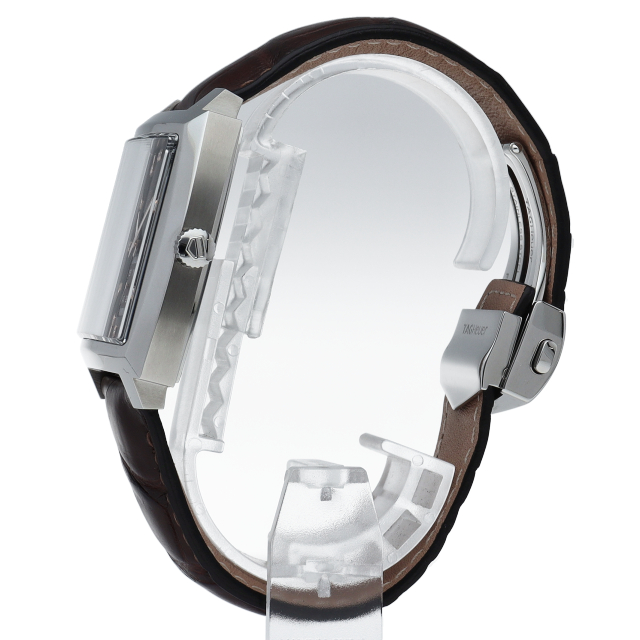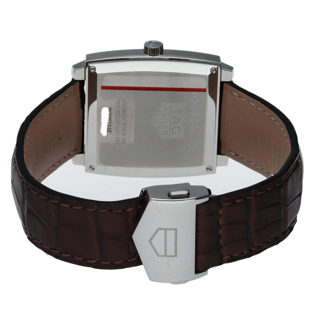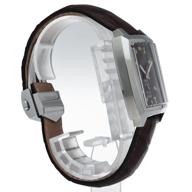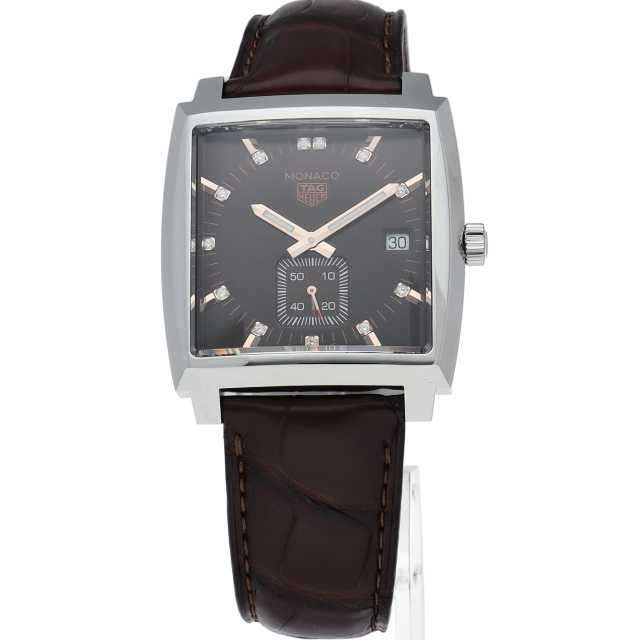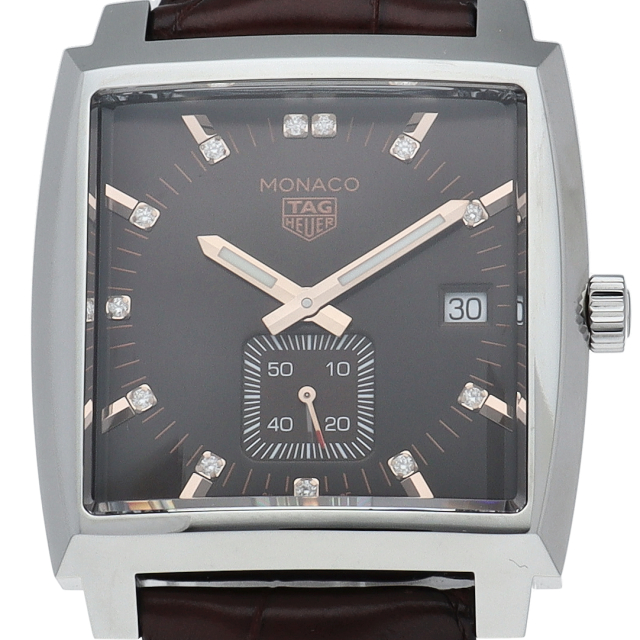 1971年公開のハリウッド映画『栄光のル・マン』でスティーブマックイーンが着けたことで一躍有名になったモデルでもあります。こちらはケース径37mmのレディースモデルで、ブラウンダイアルには12ポイントのダイヤモンドをセッティングしたフェミニンで華やかな印象のモナコです。