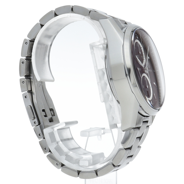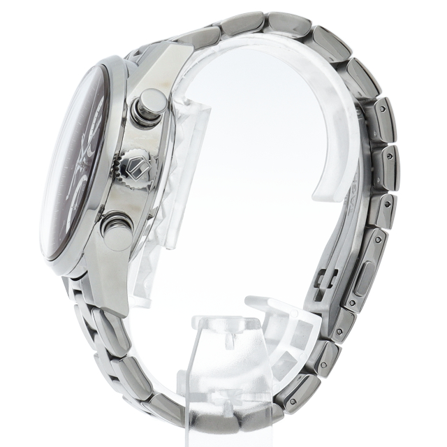 クロノグラフやデイト表示といった機能性も兼ね備えたエレガントな一本です。シャープで洗練された男性的なデザインは、ビジネスシーンにもよく似合います。