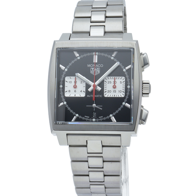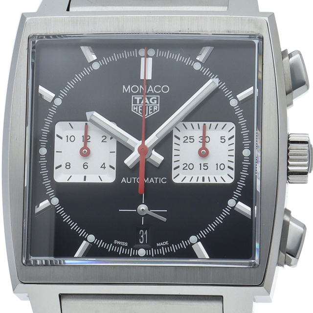 このモナコ クロノグラフは、エレガントなブラックサンレイ加工サテン仕上げのダイヤル、39mmスクエアケースにレッドのアクセントが特徴です。自社製ムーブメント キャリバー ホイヤー02も搭載していま