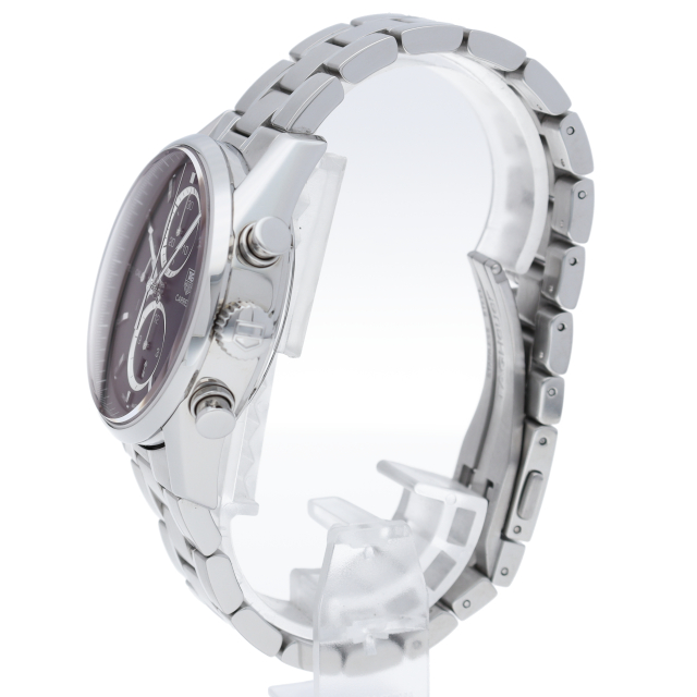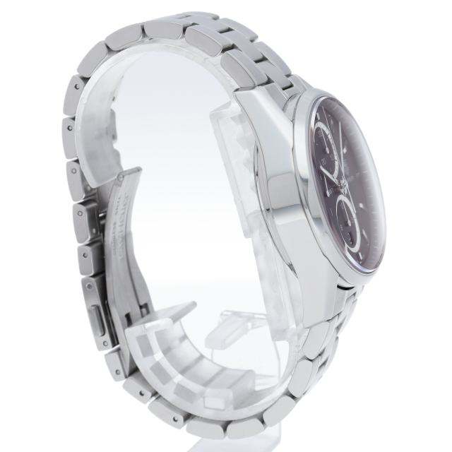 クロノグラフやデイト表示といった機能性も兼ね備えたエレガントな一本です。シャープで洗練された男性的なデザインは、ビジネスシーンにもよく似合います。