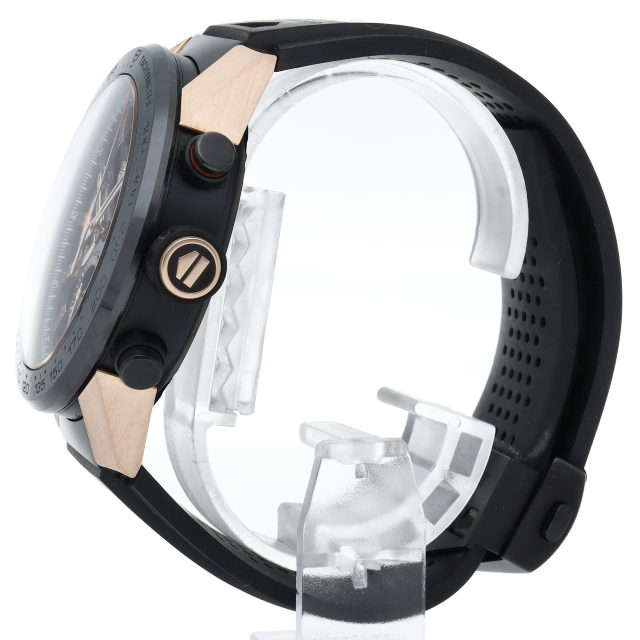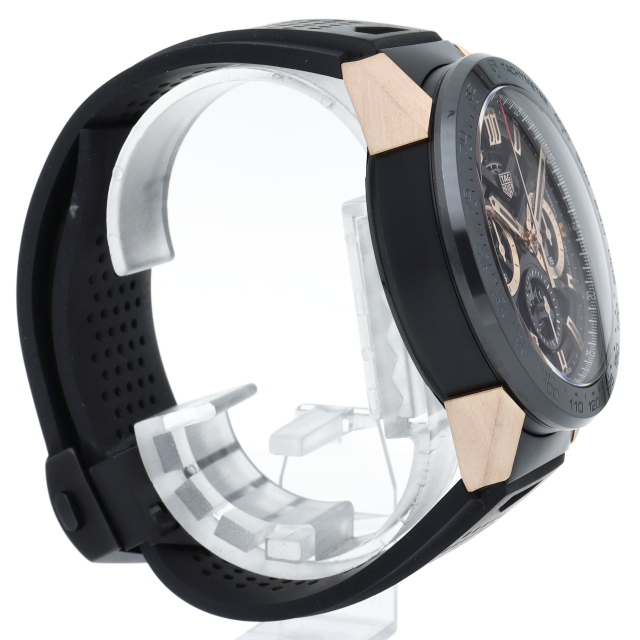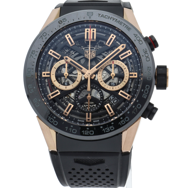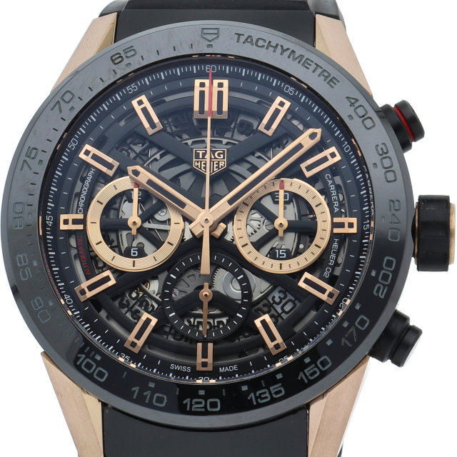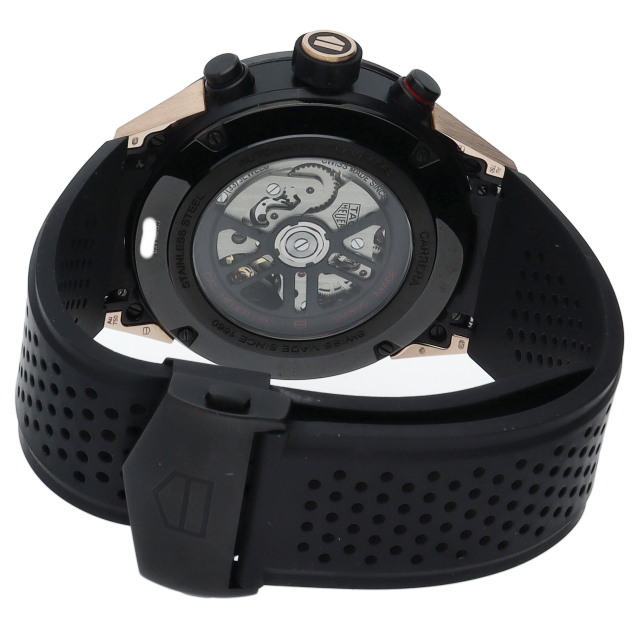 ブラックとローズゴールドのタグ・ホイヤー カレラは、80時間パワーリザーブ機能を備えた自社製ムーブメント、ホイヤー02を搭載しています。 エレガントなブラックアリゲーターレザーと、ラバーを組み合わせたストラップを付属しています。