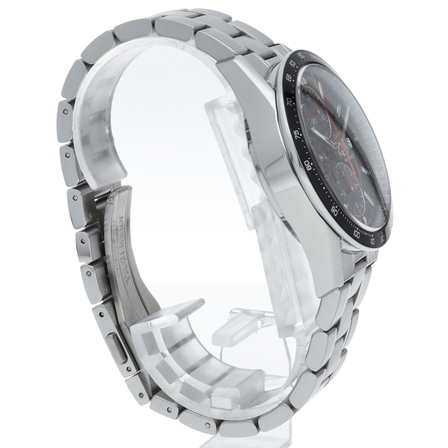 クロノグラフ針とインダイヤルの赤い指針がブラックの文字盤に映える、スポーティーかつエレガントなデザインです。機能性も兼ね備えた逸品です。