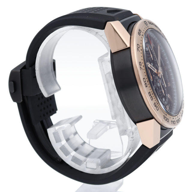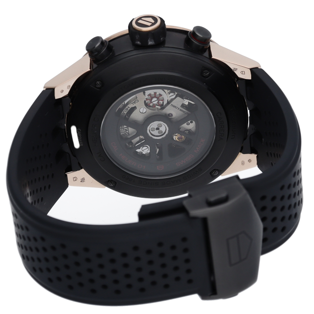 ブランドの創業者のエドワード・ホイヤーへのオマージュとして誕生した「キャリバーホイヤー01クロノグラフ」。タキメーターベゼルとラグのパーツにはピンクゴールドを使用し、ブラックカーバイドコーティングが施されたチタン製のミドルケースと裏蓋を組み合わせてスポーツ&ラグジュアリーなケースを造り出しています。