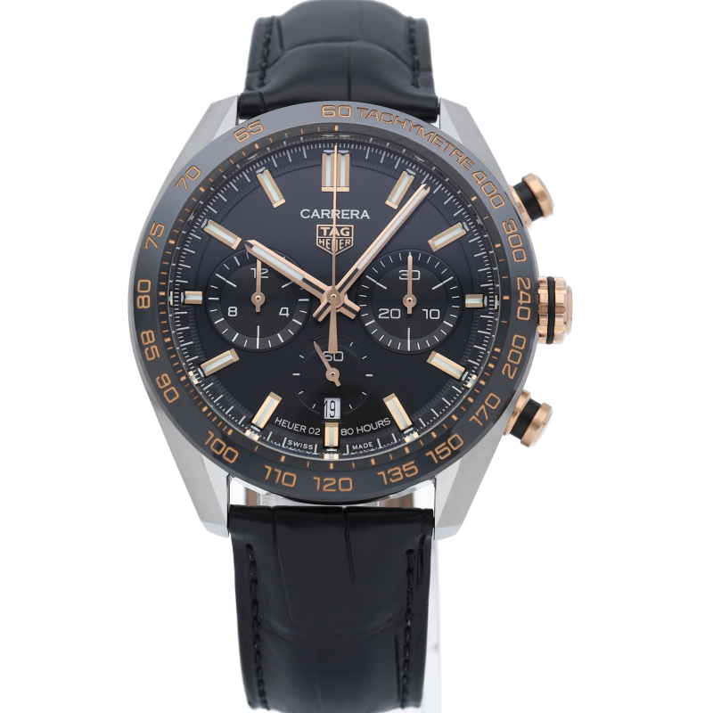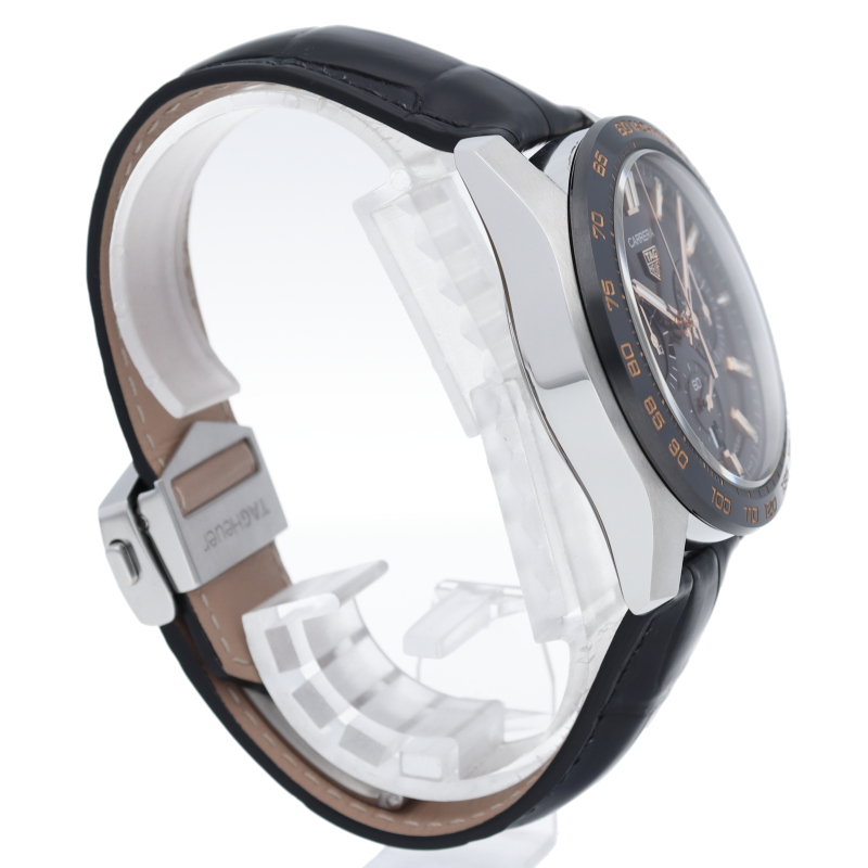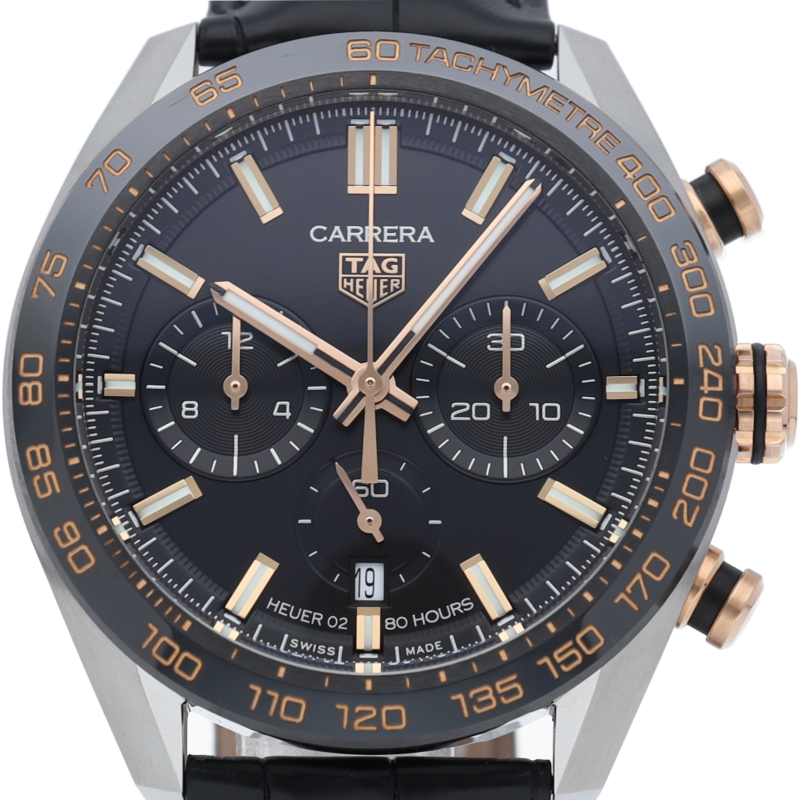 人間工学に基づき新たに設計された44mmケースを採用した【カレラ キャリバーホイヤー02 スポーツクロノグラフ】。タキメーターベゼルには耐傷性・耐久性に優れたセラミックを採用し、ムーブメントには80時間ものロングパワーリザーブを誇る、垂直クラッチ式クロノグラフムーブメントの「ホイヤー02」を搭載。