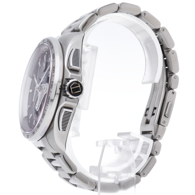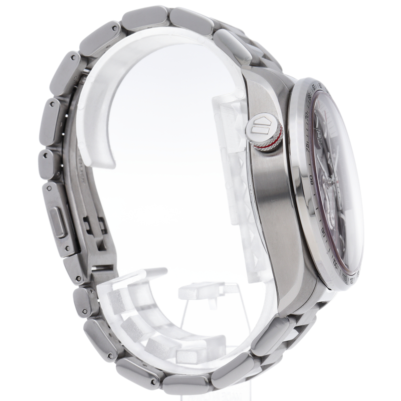 タグホイヤーの上級人気モデル「グランドカレラ」。ディスク回転式のインダイヤルを配置し、クロノグラフやデイト表示も搭載。秒針はカウントを赤と黒のラインで表示し、30分計と12時間計には回転ディスク式を採用した機能性・デザイン性共に優れた1本。