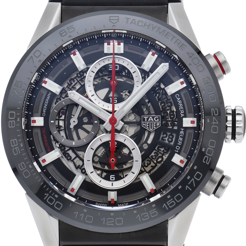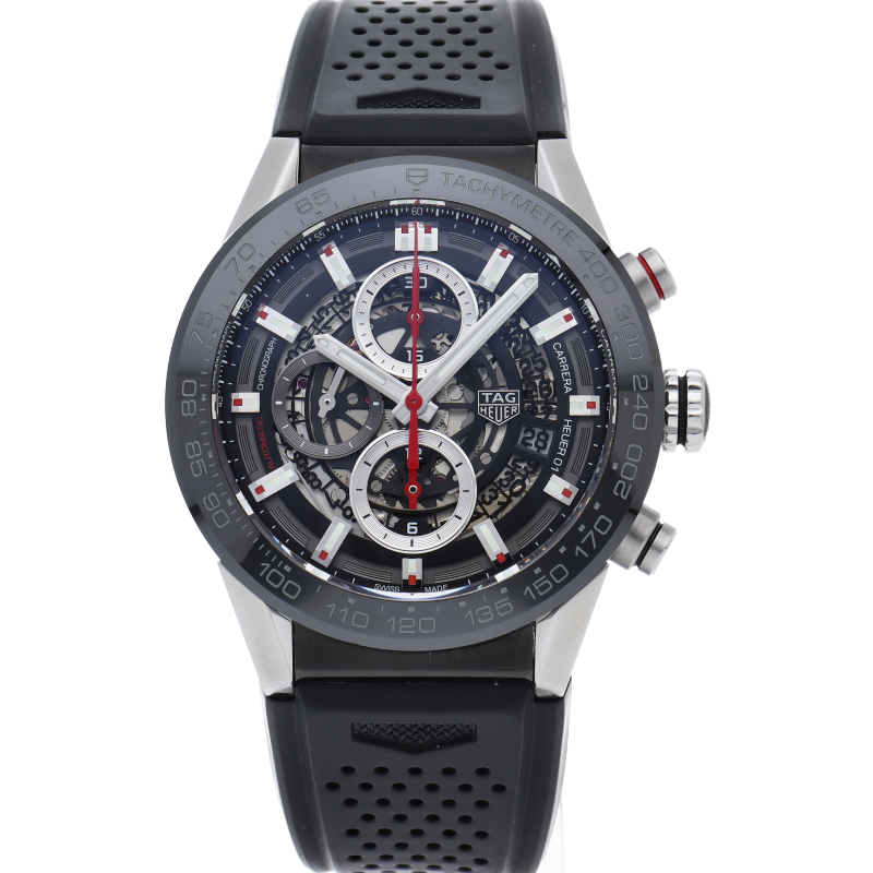 「カレラ キャリバーホイヤー01クロノグラフ」から2mmダウンサイジングした43mmケース。タキメーターベゼルには耐傷性に優れたブラックセラミックを採用し、文字盤をスケルトン仕様にすることでスポーティーでメカニックな印象のモデルです。ムーブメントにはブラックコーティングが施されたローターと赤色のコラムホイールが特徴のキャリバー「ホイヤー01」を搭載します。