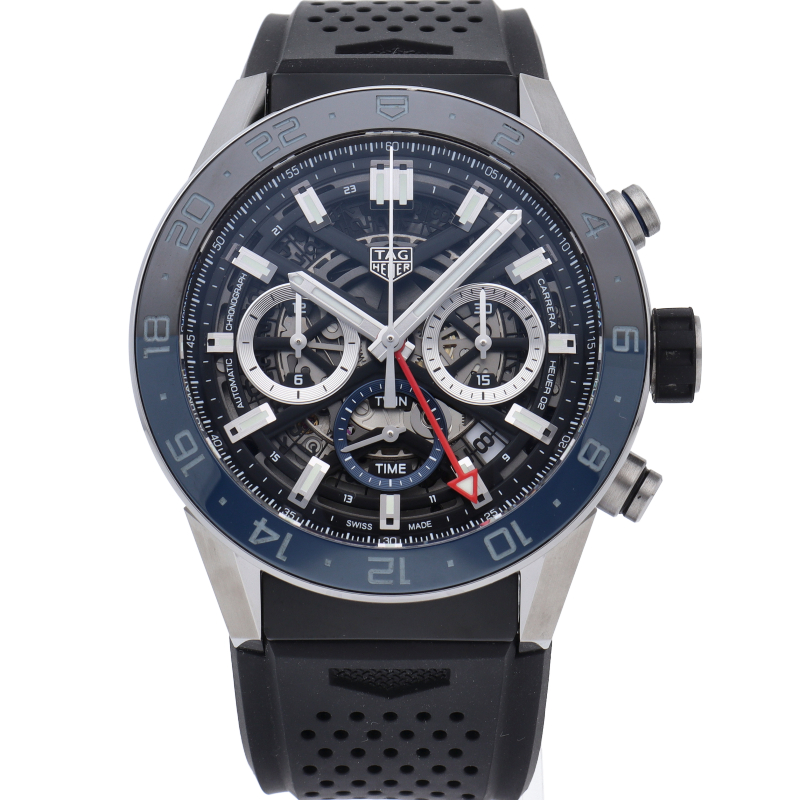 ブランドの創業者のエドワード・ホイヤーへのオマージュとして誕生したカレラシリーズのひとつ「カレラ キャリバーホイヤー02 クロノグラフGMT」。GMTベゼルには耐傷性・耐久性に優れたセラミックベゼルを採用。文字盤をスケルトン仕様にしたことでスポーティーでメカニカルな印象を与えます。