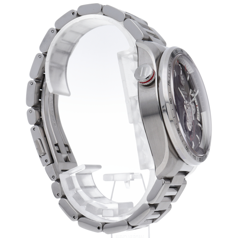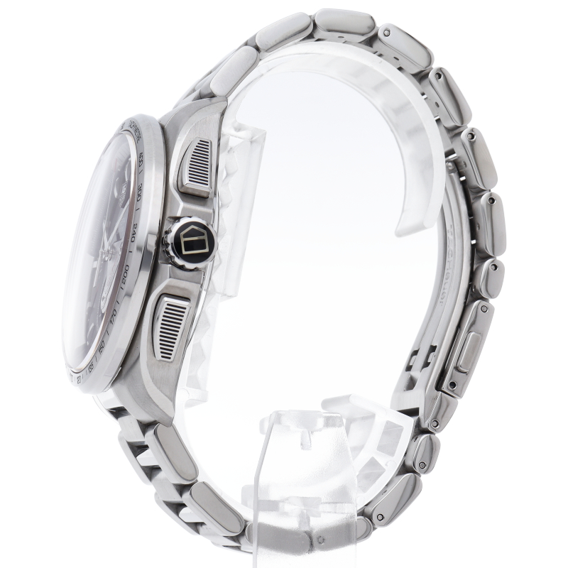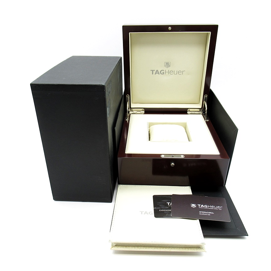 タグホイヤーの上級人気モデル「グランドカレラ」。ディスク回転式のインダイヤルを配置し、クロノグラフやデイト表示も搭載。秒針はカウントを赤と黒のラインで表示し、30分計と12時間計には回転ディスク式を採用した機能性・デザイン性共に優れた1本。
