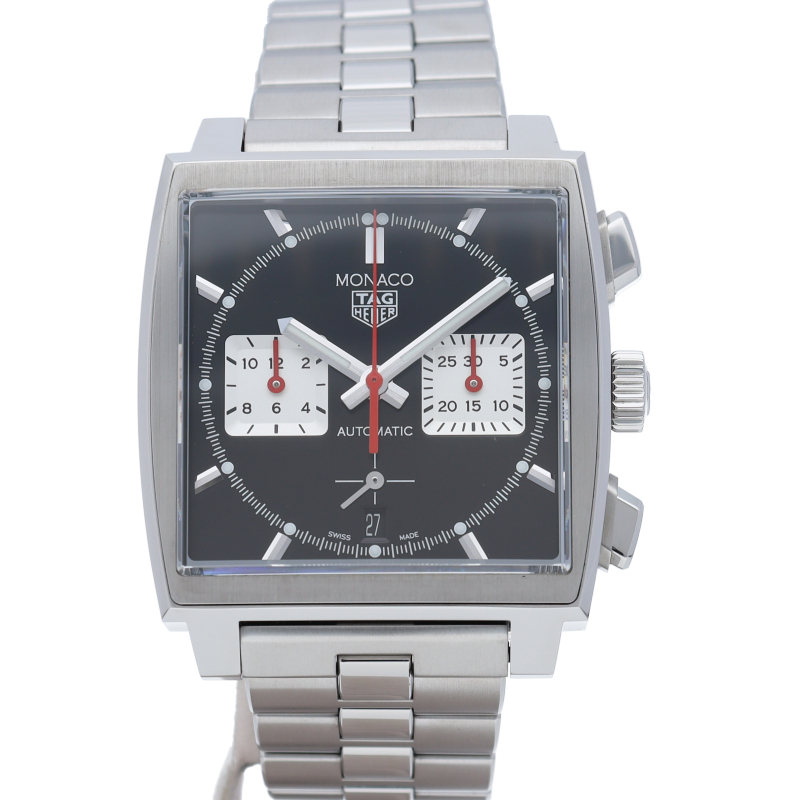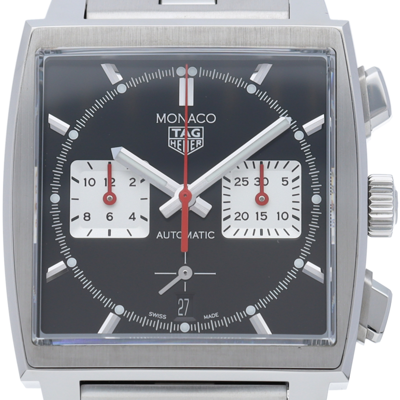 このモナコクロノグラフは、エレガントなブラックサンレイ加工サテン仕上げのダイヤルに39mmスクエアケースにレッドのアクセントが特徴です。自社製ムーブメントキャリバー ホイヤー02も搭載しています。