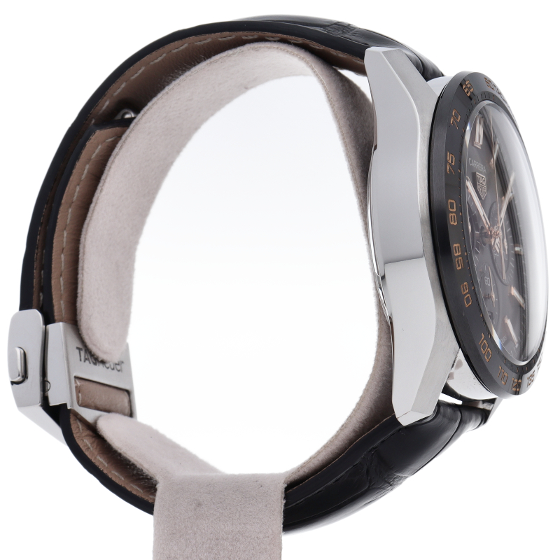 人間工学に基づき新たに設計された44mmケースを採用した【カレラ キャリバーホイヤー02 スポーツクロノグラフ】。タキメーターベゼルには耐傷性・耐久性に優れたセラミックを採用し、ムーブメントには80時間ものロングパワーリザーブを誇る、垂直クラッチ式クロノグラフムーブメントの「ホイヤー02」を搭載。