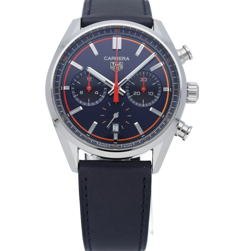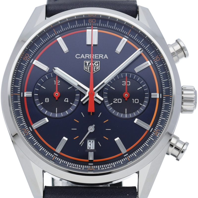モダンでダイナミックなデザインに作られたこのタグホイヤー カレラ クロノグラフは、モーターレーシングの精神を全面に押し出しています。目を引くオレンジのグラデーションリングと鮮やかなオレンジのタッチを添えた、深みのあるブルーダイヤルに、ブルーのカーフスキンストラップが美しくマッチ。勝利を見据えたデザインです。