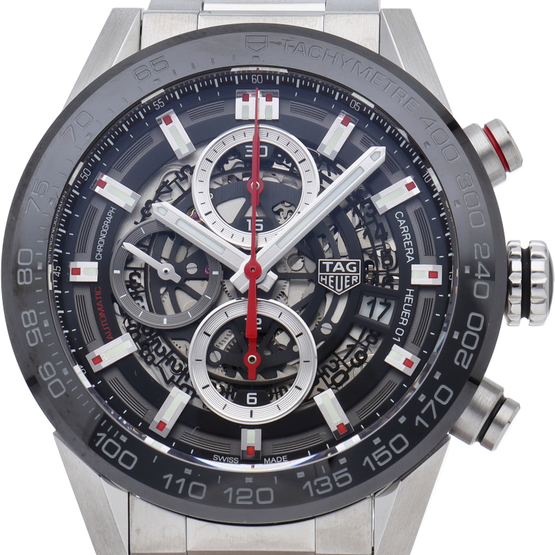 「カレラ キャリバーホイヤー01クロノグラフ」から2mmダウンサイジングした43mmケース。タキメーターベゼルには耐傷性に優れたブラックセラミックを採用し、文字盤をスケルトン仕様にすることでスポーティーでメカニックな印象のモデルです。ムーブメントにはブラックコーティングが施されたローターと赤色のコラムホイールが特徴のキャリバー「ホイヤー01」を搭載します。