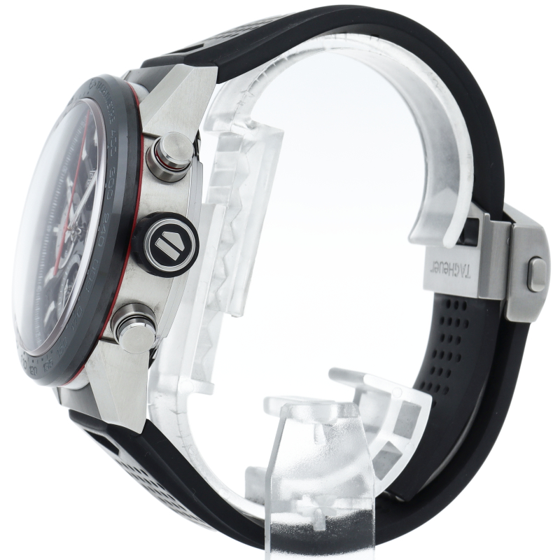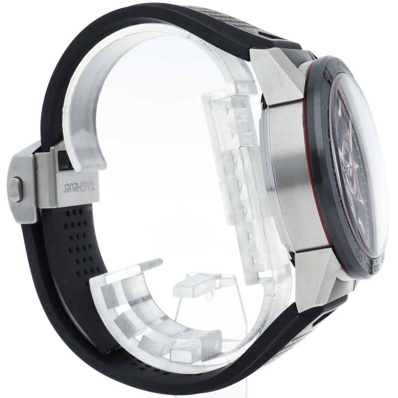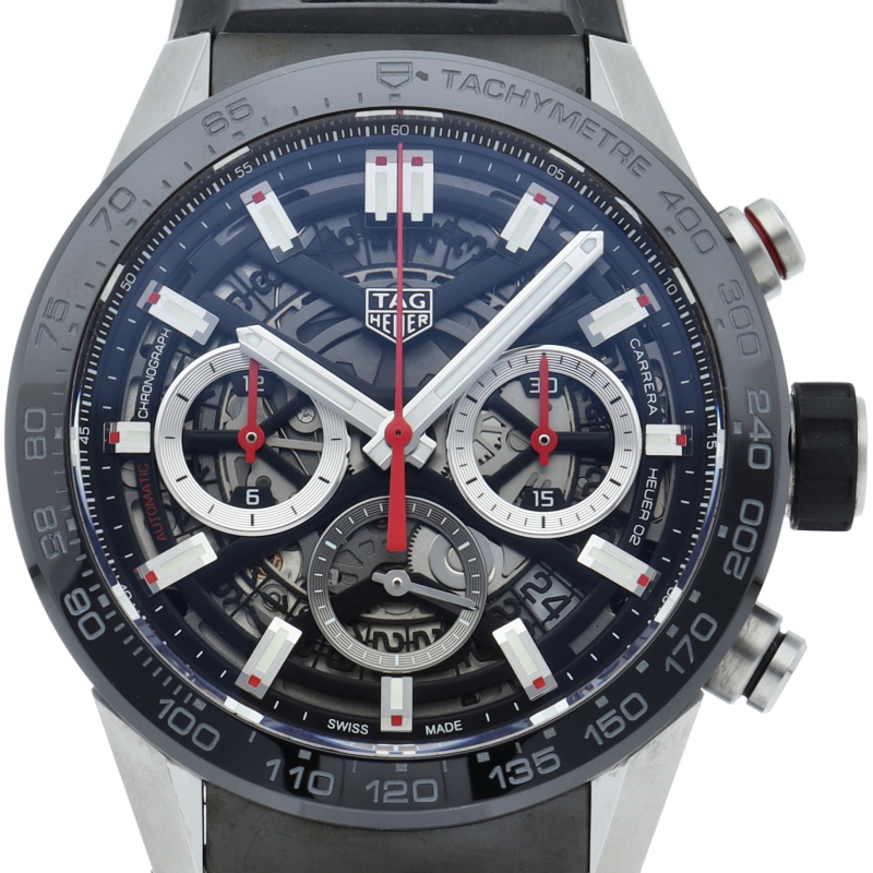 H型ブレスレットが付いた、ブラックスティール&セラミック製タグ・ホイヤー カレラ02クロノグラフ。 この「タグ・ホイヤー カレラ」ラインのフラッグシップモデルでは、スケルトンダイアルとサファイアクリスタルのケースバックから、驚異の技術力を示す80時間のパワーリザーブを備えた自社製ホイヤー02ムーブメントを堪能できます。