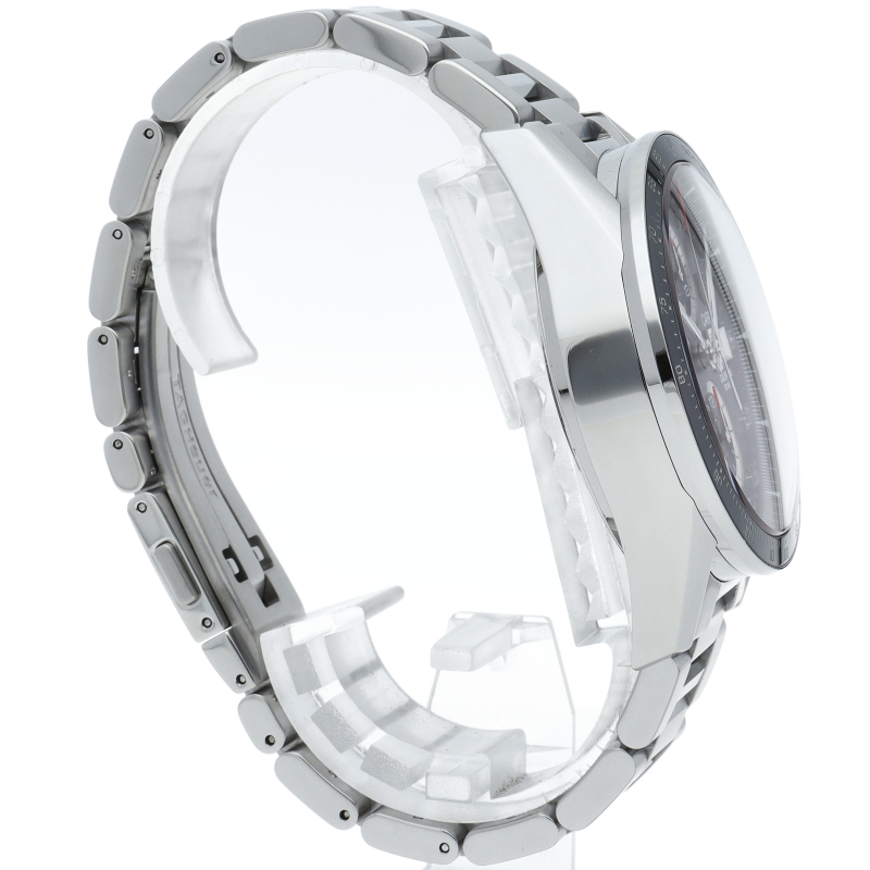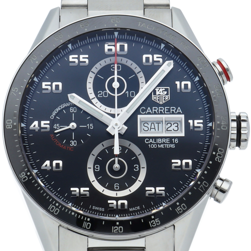 カレラクロノグラフタキメーターのケースと文字盤をベースに曜日表示を加え、カレラタキメーターの防水機能と重厚なブレスレットをもって新たに登場しました。クロノグラフ秒針とスタートボタンには、さり気なくレッドの差し色が施されています。また、サファイアクリスタルの風防には、両面反射防止コーティングが施され、更に文字盤の視認性が良くなっています。