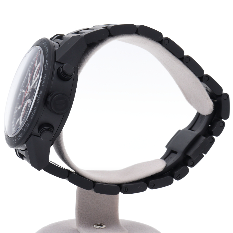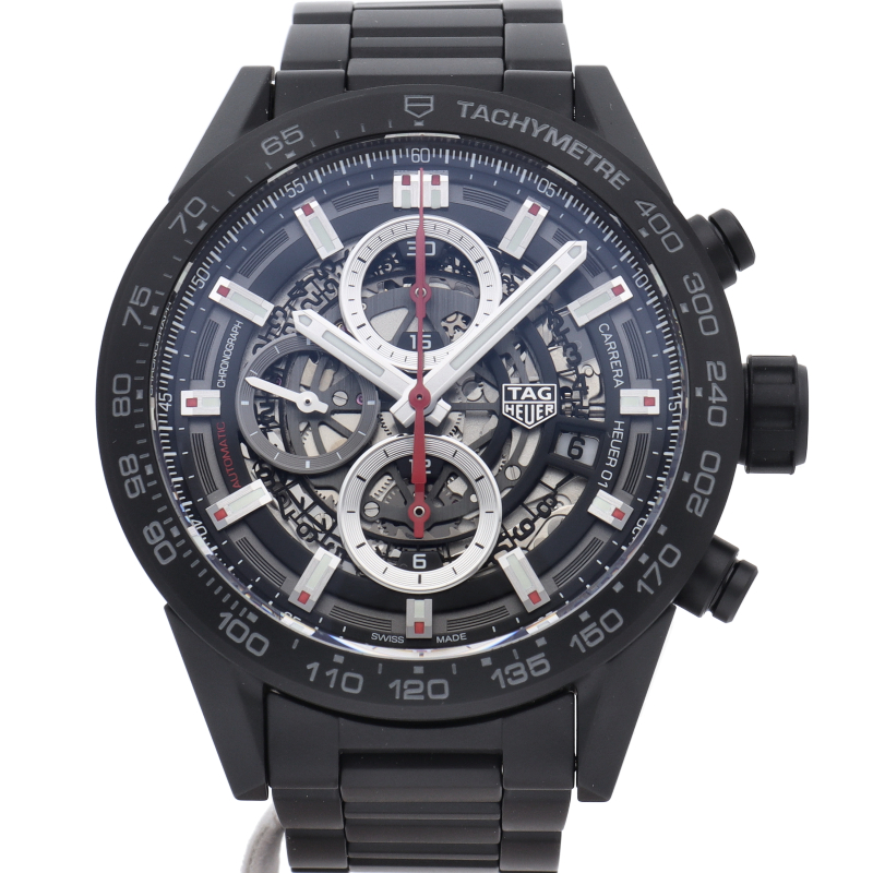 「カレラ キャリバーホイヤー01クロノグラフ」から2mmダウンサイジングした43mmケース。タキメーターベゼルには耐傷性に優れたブラックセラミックを採用し、文字盤をスケルトン仕様にすることでスポーティーでメカニックな印象のモデルです。ムーブメントにはブラックコーティングが施されたローターと赤色のコラムホイールが特徴のキャリバー「ホイヤー01」を搭載します。
