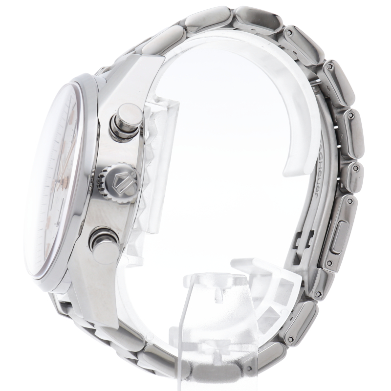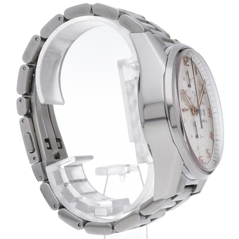 カレラクロノグラフタキメーターのケースと文字盤をベースに曜日表示を加え、カレラタキメーターの防水機能と重厚なブレスレットをもって新たに登場しました。クロノグラフ秒針とスタートボタンには、さり気なくレッドの差し色が施されています。また、サファイヤクリスタルの風防には、両面反射防止コーティングが施され、更に文字盤の視認性が良くなっています。