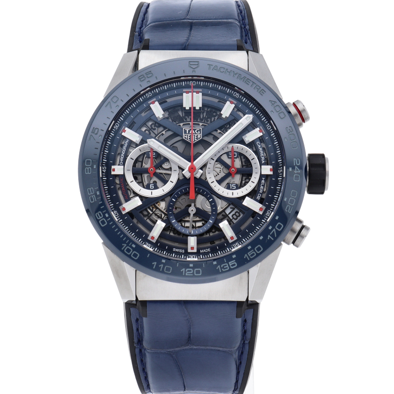 ブランドの創業者のエドワード・ホイヤーへのオマージュとして誕生した「キャリバーホイヤー」。自社開発ムーブメント「ホイヤー02」を搭載した「カレラ キャリバー ホイヤー02」。45mmという大型ケースにブラックとブルーのセラミック製ベゼルが今まで以上にモータースポーツを連想させてくれるスポーティなモデルになっています。