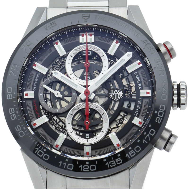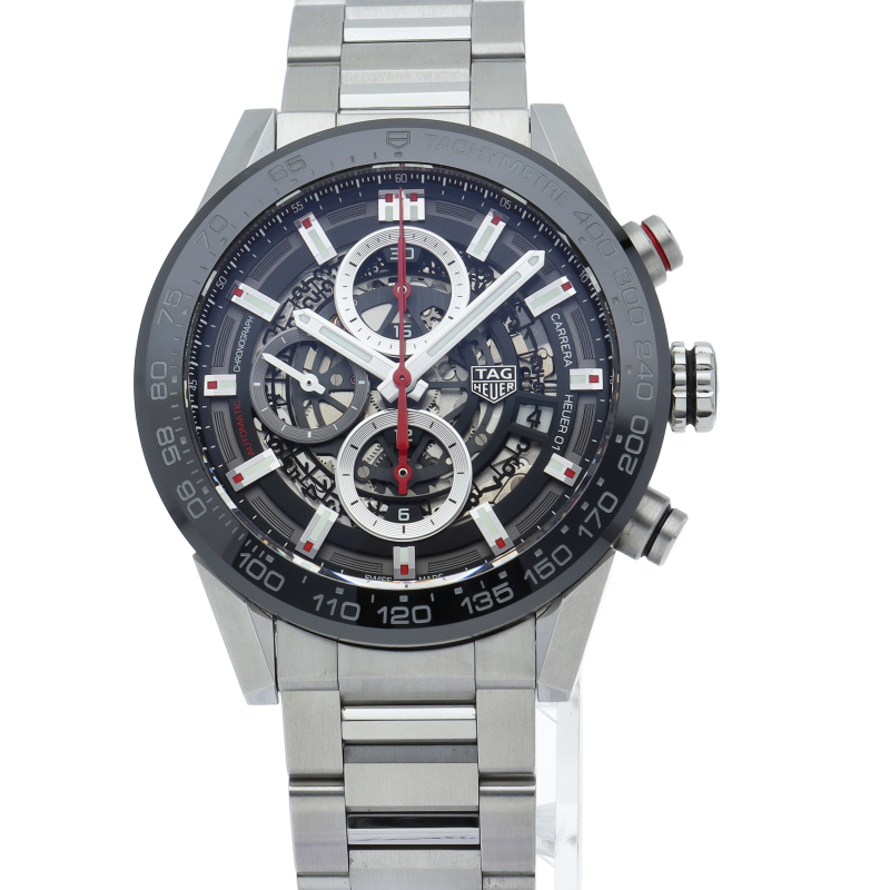 「カレラ キャリバーホイヤー01クロノグラフ」から2mmダウンサイジングした43mmケース。タキメーターベゼルには耐傷性に優れたブラックセラミックを採用し、文字盤をスケルトン仕様にすることでスポーティーでメカニックな印象のモデルです。ムーブメントにはブラックコーティングが施されたローターと赤色のコラムホイールが特徴のキャリバー「ホイヤー01」を搭載します。