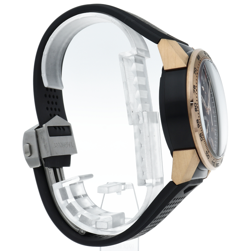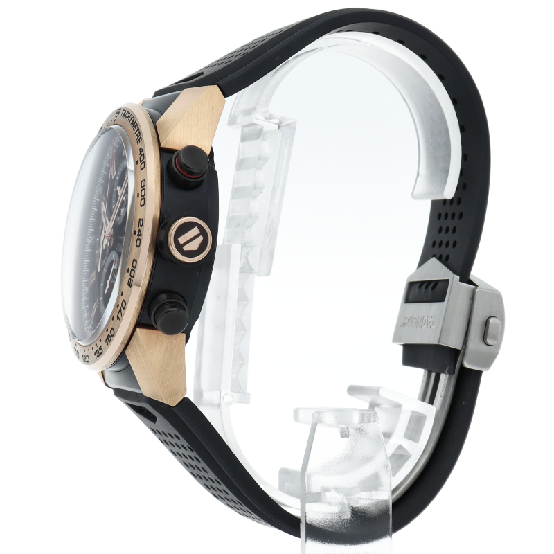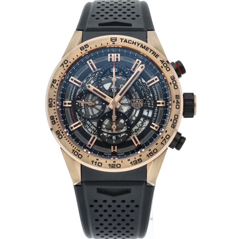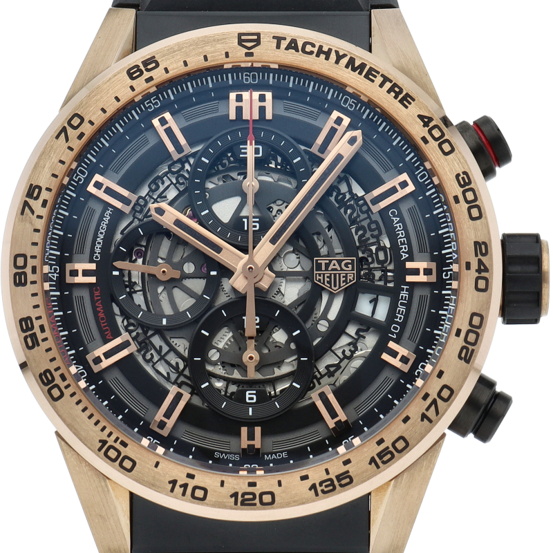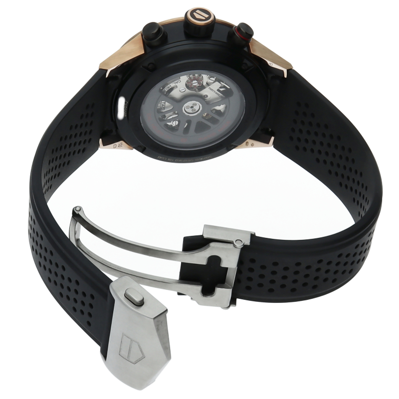 18Kローズゴールド製のタキメーターベゼルとラグが厚さ17ミリの43ミリ100m防水ケース&ラバーベルトのブラックに引き立つカレラは、スケルトンダイヤルからコラムホイール式自社製自動巻きムーブメントcal.ホイヤー01を覗くタグホイヤー人気のクロノグラフ。