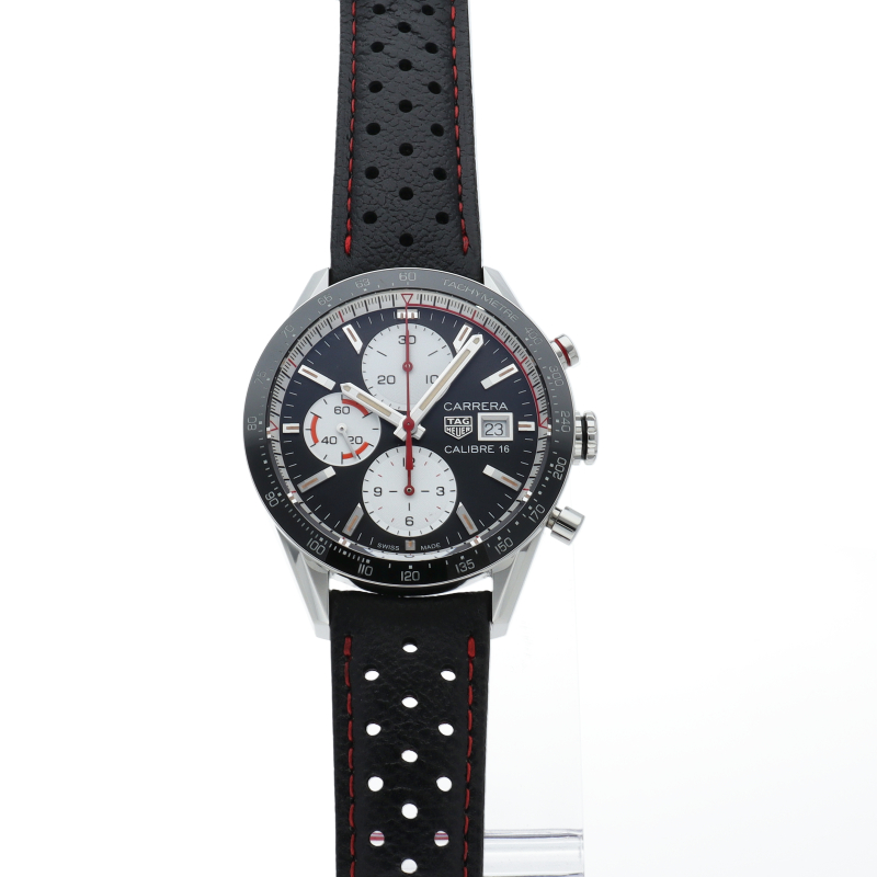 タグホイヤーの人気シリーズ「カレラ キャリバー16」。機能性とデザイン性を備え、キャリバー16を搭載したパワフルなクロノグラフ。ヴィンテージ感のあるスポーティーなデザインです。レッドのアクセントがモータースポーツとの関りを想起させます。ベゼル上のスケールは、モーターレースの出現によって読み取りやすい計時が求められるようになった1970年代にインスパイアされています。