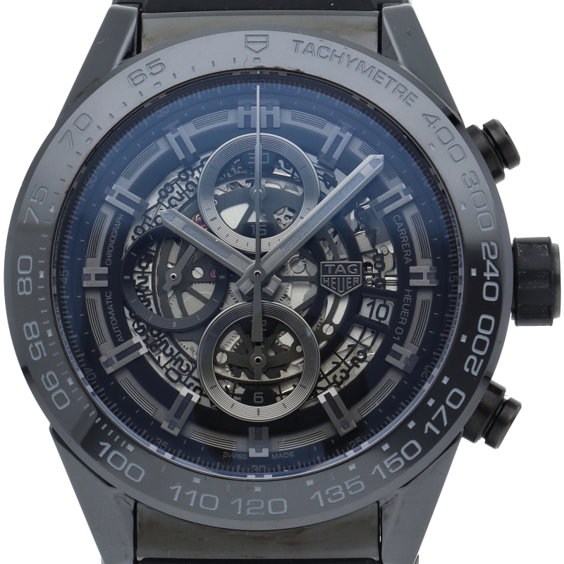 ブランドの創業者のエドワード・ホイヤーへのオマージュとして誕生した「キャリバーホイヤー01クロノグラフ」。キメーターベゼルとケースには耐傷性に優れたポリッシュ仕上げのブラックセラミックを採用。また、文字盤をスケルトン仕様にすることでスポーティーでメカニカルな印象のモデルとなりました。
