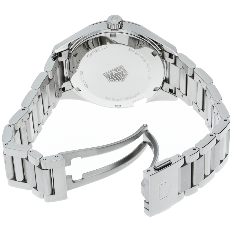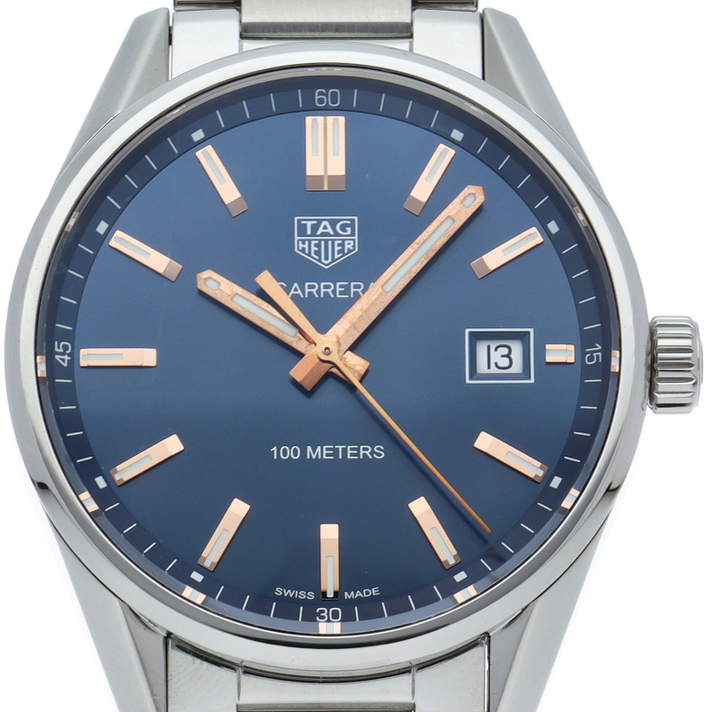 今までのカレラシリーズが持つスポーティーな雰囲気を守りつつ、クラシックかつエレガントなデザインの「カレラ ローズゴールドアクセント」。ブルーダイアル上のアワーインデックスと針にローズゴールドメッキを施して高級感を演出しています。