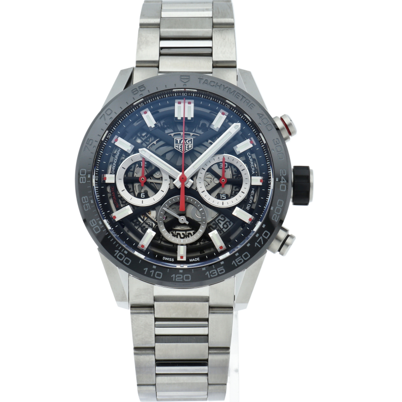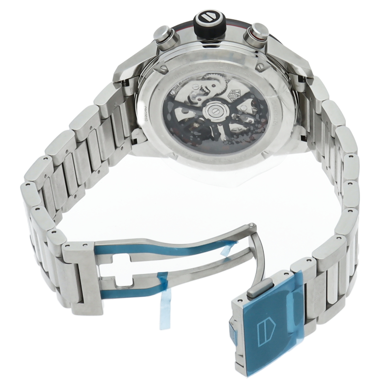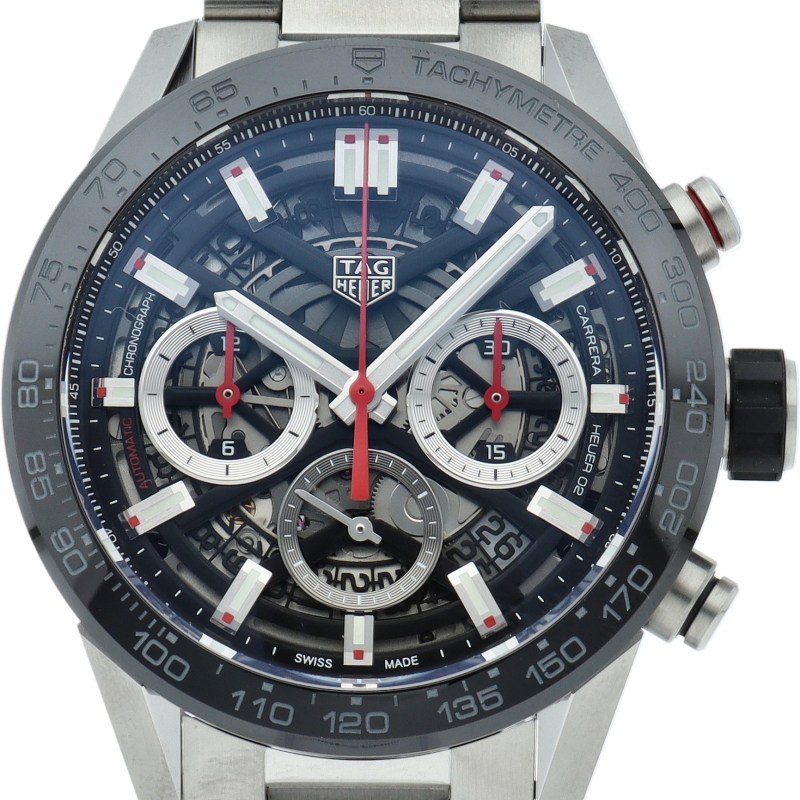 H型ブレスレットが付いた、ブラックスティール&セラミック製タグ・ホイヤー カレラ02クロノグラフ。 この「タグ・ホイヤー カレラ」ラインのフラッグシップモデルでは、スケルトンダイアルとサファイアクリスタルのケースバックから、驚異の技術力を示す80時間のパワーリザーブを備えた自社製ホイヤー02ムーブメントを堪能できます。
