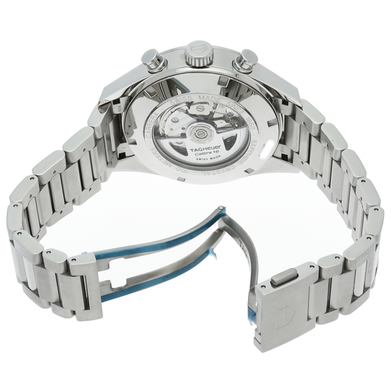 カレラクロノグラフタキメーターのケースと文字盤をベースに曜日表示を加え、カレラタキメーターの防水機能と重厚なブレスレットをもって新たに登場しました。クロノグラフ秒針とスタートボタンには、さり気なくレッドの差し色が施されています。また、サファイヤクリスタルの風防には、両面反射防止コーティングが施され、更に文字盤の視認性が良くなっています。