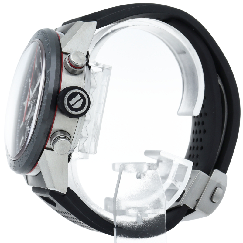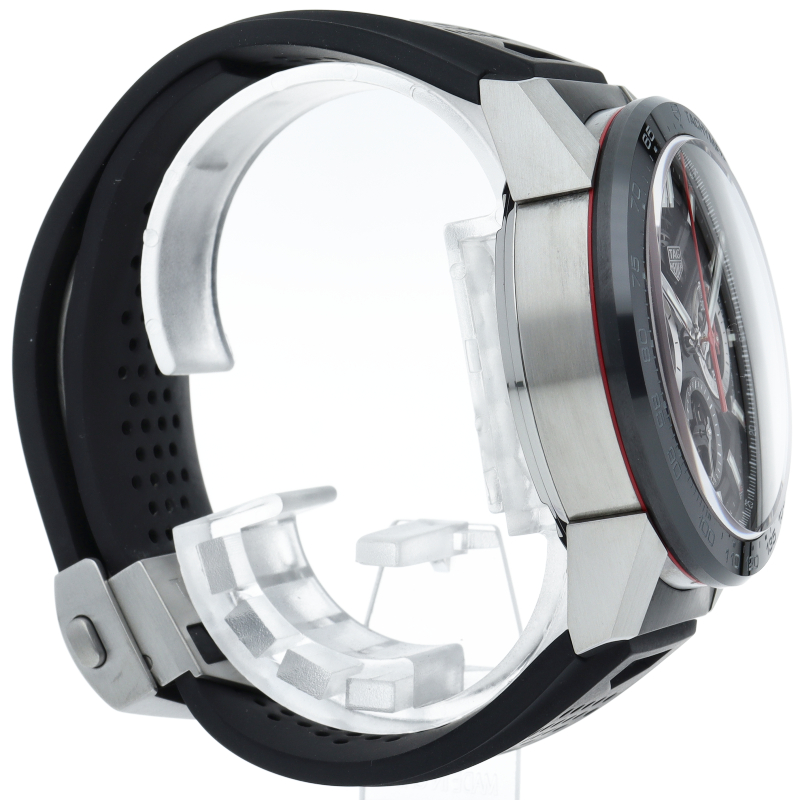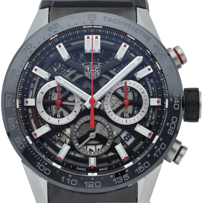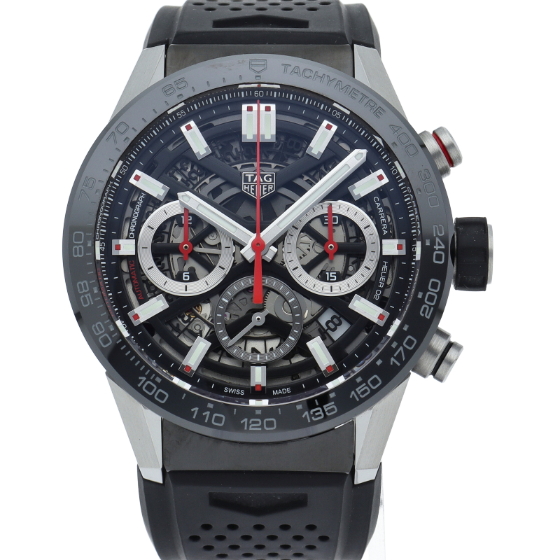 H型ブレスレットが付いた、ブラックスティール&セラミック製タグ・ホイヤー カレラ02クロノグラフ。 この「タグ・ホイヤー カレラ」ラインのフラッグシップモデルでは、スケルトンダイアルとサファイアクリスタルのケースバックから、驚異の技術力を示す80時間のパワーリザーブを備えた自社製ホイヤー02ムーブメントを堪能できます。