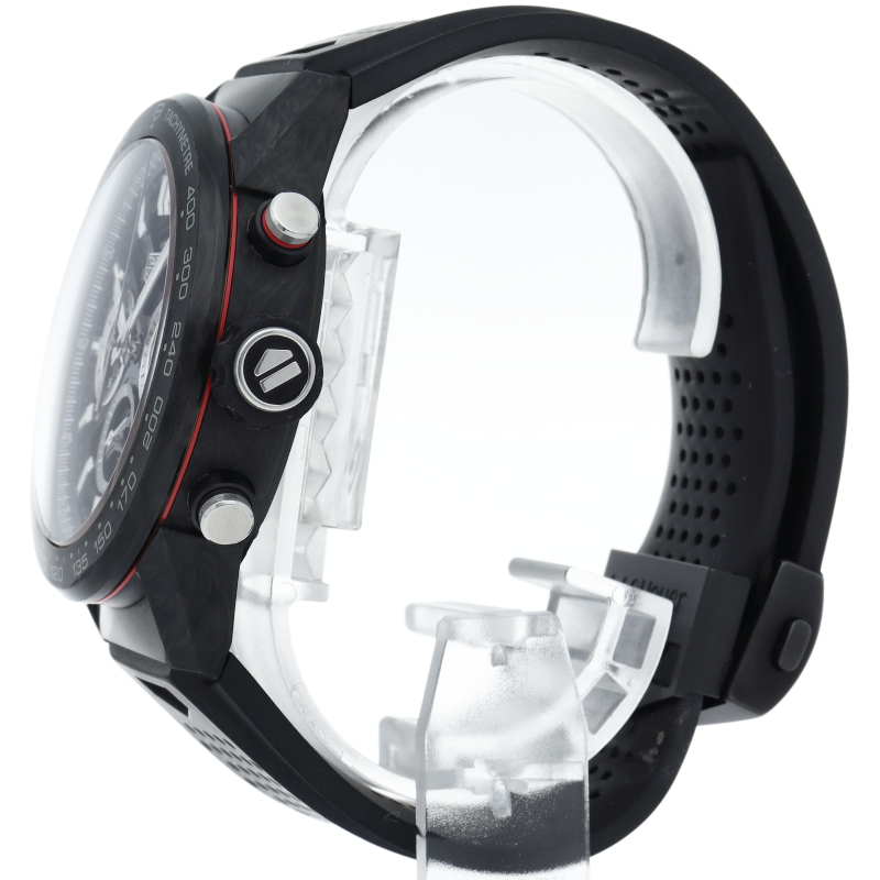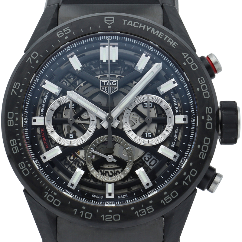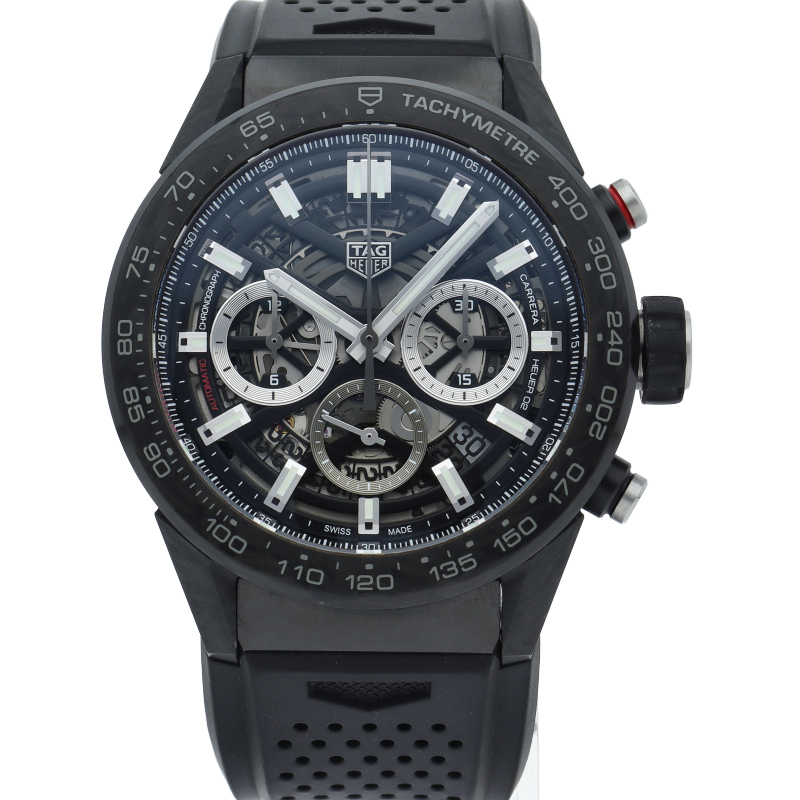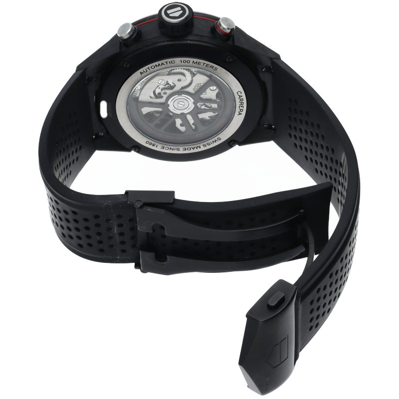 タグ・ホイヤーカレラブラックエディションは、カーボンファイバー製ベゼルとラグ、モーターレーシングをイメージしたパンチング加工ラバーストラップを備えています。スケルトンダイアルおよびブラックPVDスティール製サファイアケースバックから眺めることができる自社製自動巻ムーブメント、ホイヤー02は80時間のパワーリザーブを供給します。