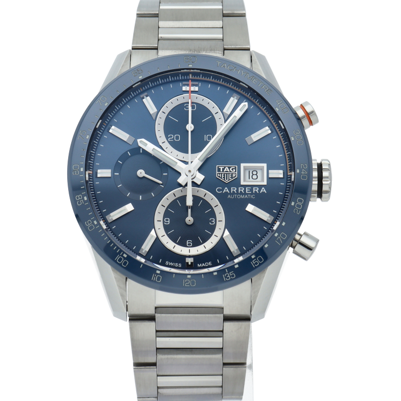スポーティな「タグ・ホイヤー カレラ」では、ブルーサンレイ加工のサテン仕上げダイアルに、伝統的な6-9-12時位置のサブダイアル構造と、ソリッドスティール製H型ブレスレットが組み合わされています。