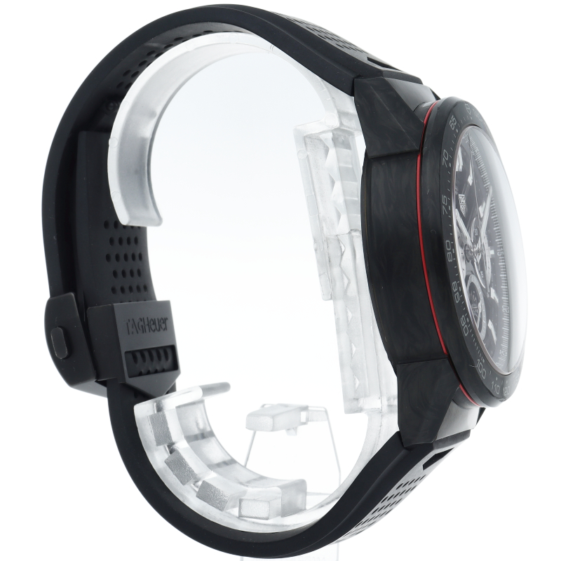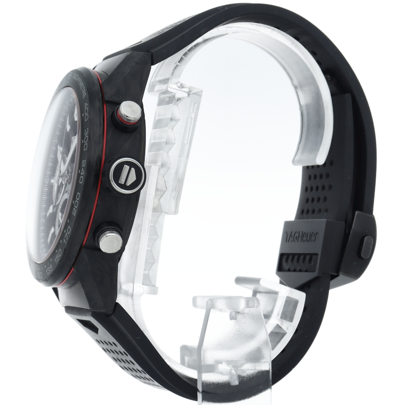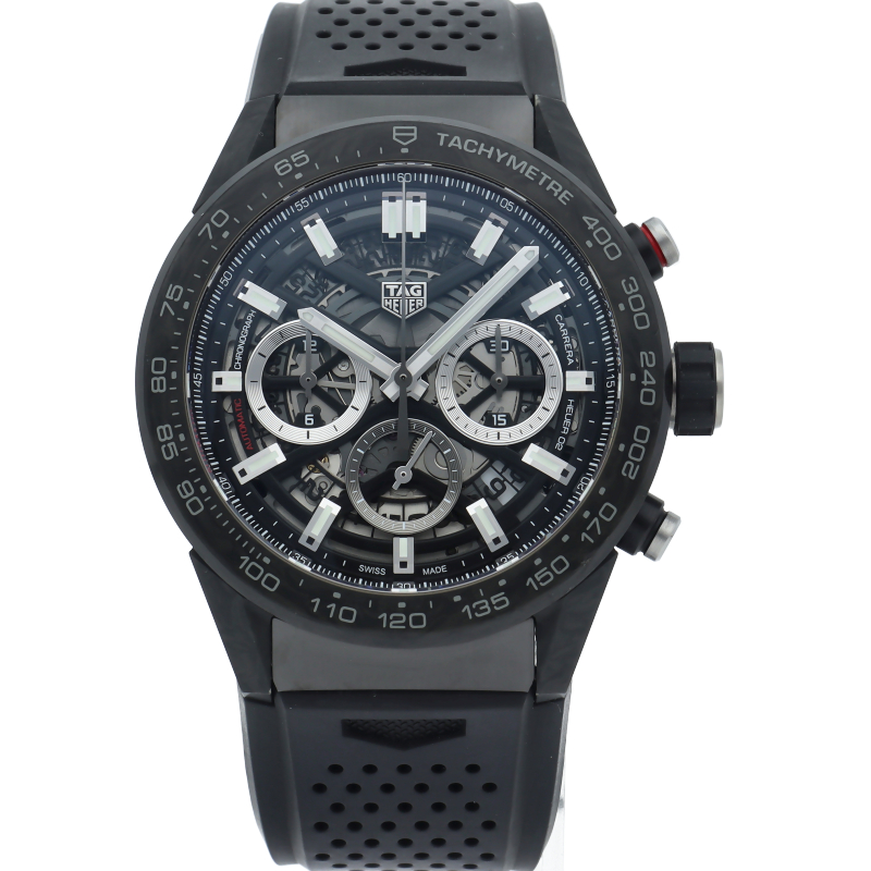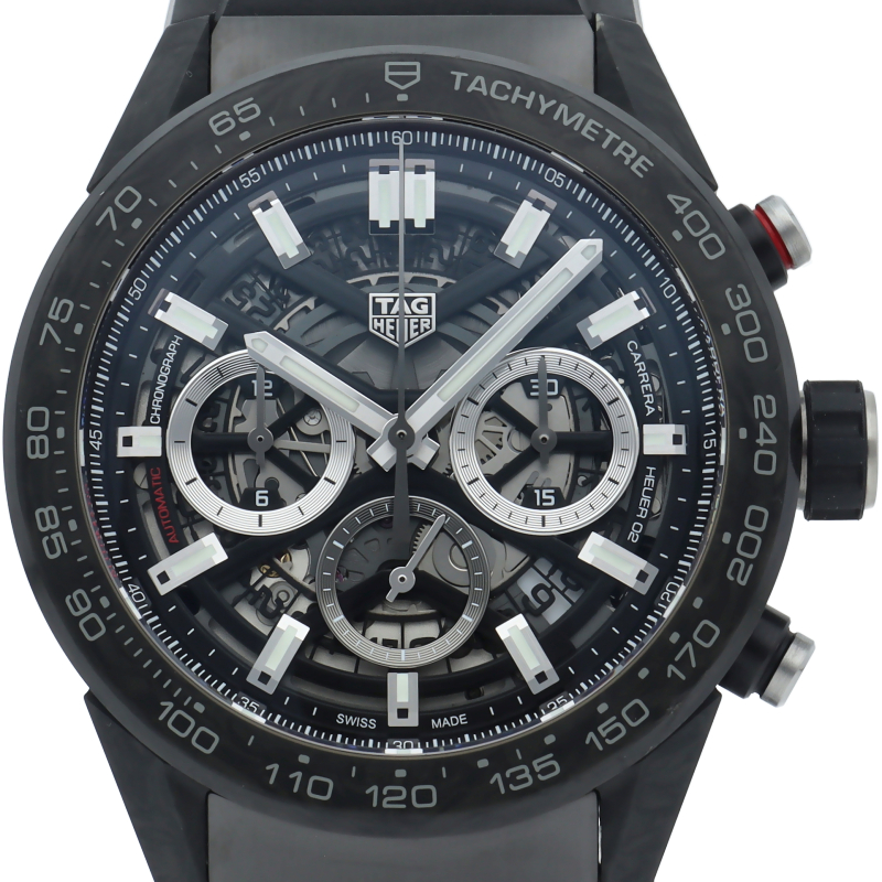 タグ・ホイヤーカレラブラックエディションは、カーボンファイバー製ベゼルとラグ、モーターレーシングをイメージしたパンチング加工ラバーストラップを備えています。スケルトンダイアルおよびブラックPVDスティール製サファイアケースバックから眺めることができる自社製自動巻ムーブメント、ホイヤー02は80時間のパワーリザーブを供給します。