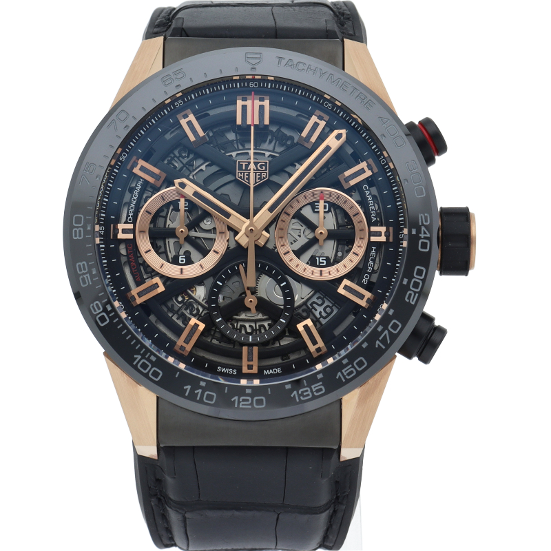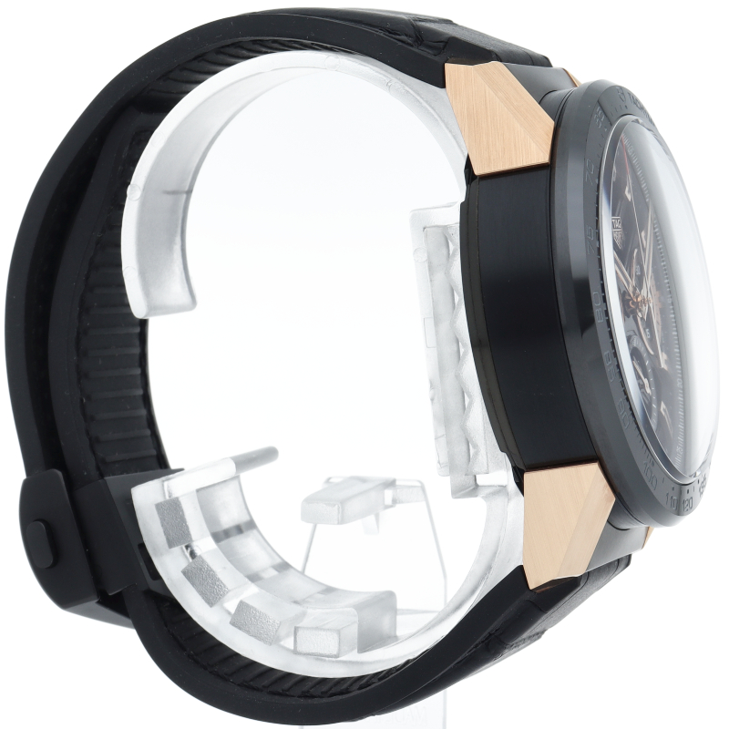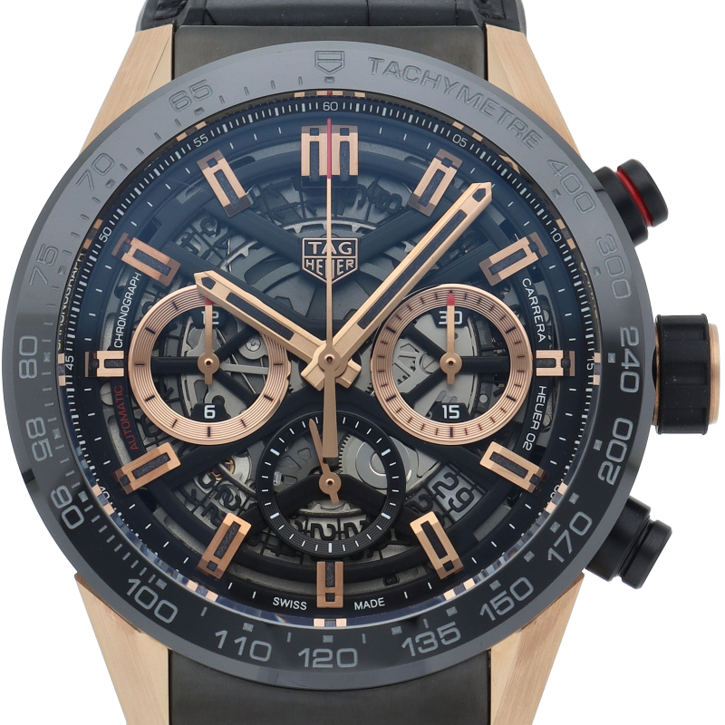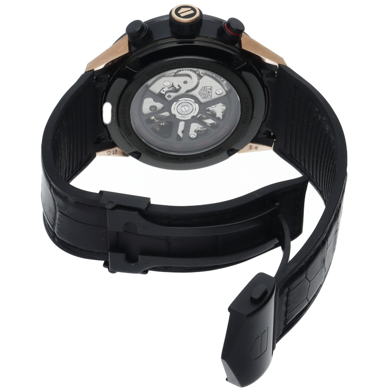 アリゲーター&ラバー製ブラックストラップを備えた、ブラックスティールとローズゴールドが美しいタグ・ホイヤー カレラ ホイヤー02。43mm自動巻クロノグラフに搭載された80時間パワーリザーブ機能付きムーブメントは、サファイアケースバックから眺めることができます。
