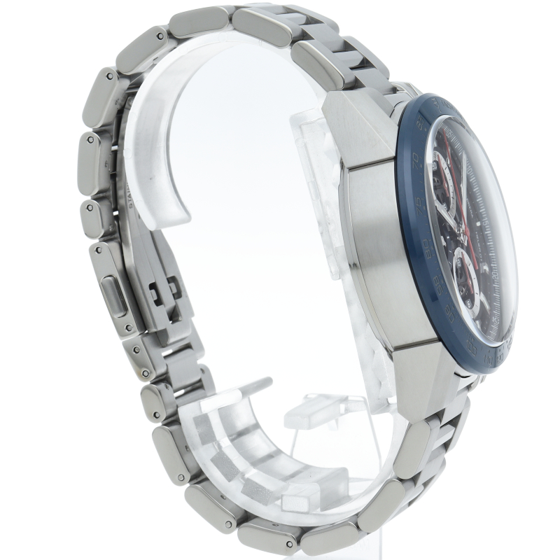 「カレラ キャリバーホイヤー01クロノグラフ」から2mmダウンサイジングした43mmケース。タキメーターベゼルには耐傷性に優れたブラックセラミックを採用し、文字盤をスケルトン仕様にすることでスポーティーでメカニックな印象のモデルです。ムーブメントにはブラックコーティングが施されたローターと赤色のコラムホイールが特徴のキャリバー「ホイヤー01」を搭載します。