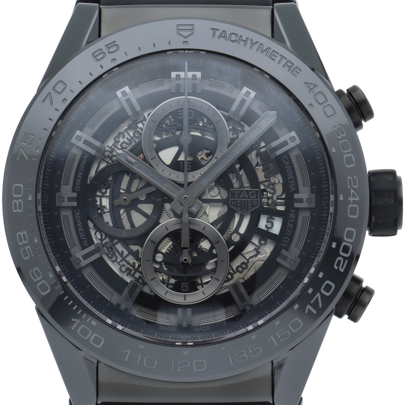 ブランドの創業者のエドワード・ホイヤーへのオマージュとして誕生した「キャリバーホイヤー01クロノグラフ」。キメーターベゼルとケースには耐傷性に優れたポリッシュ仕上げのブラックセラミックを採用。また、文字盤をスケルトン仕様にすることでスポーティーでメカニカルな印象のモデルとなりました。