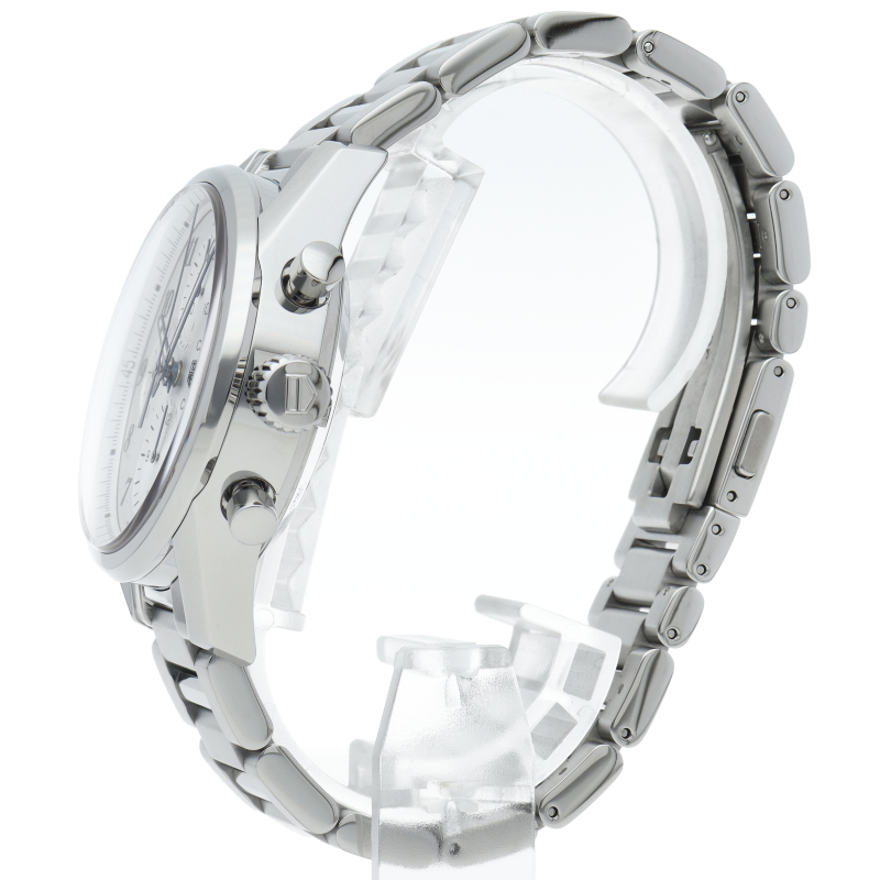 モーターレースからインスピレーションを受けて誕生した“カレラ”。こちらはホワイトオパーリンをベースにブルーをアクセントにした3カウンタークロノグラフで、スタイリッシュなデザインが印象的なモデルです。日本限定500本。ムーブメントは自動巻き“キャリバー16”を搭載。パワーリザーブ42時間、防水性100m。