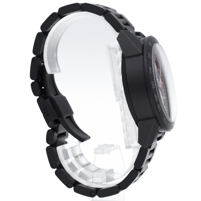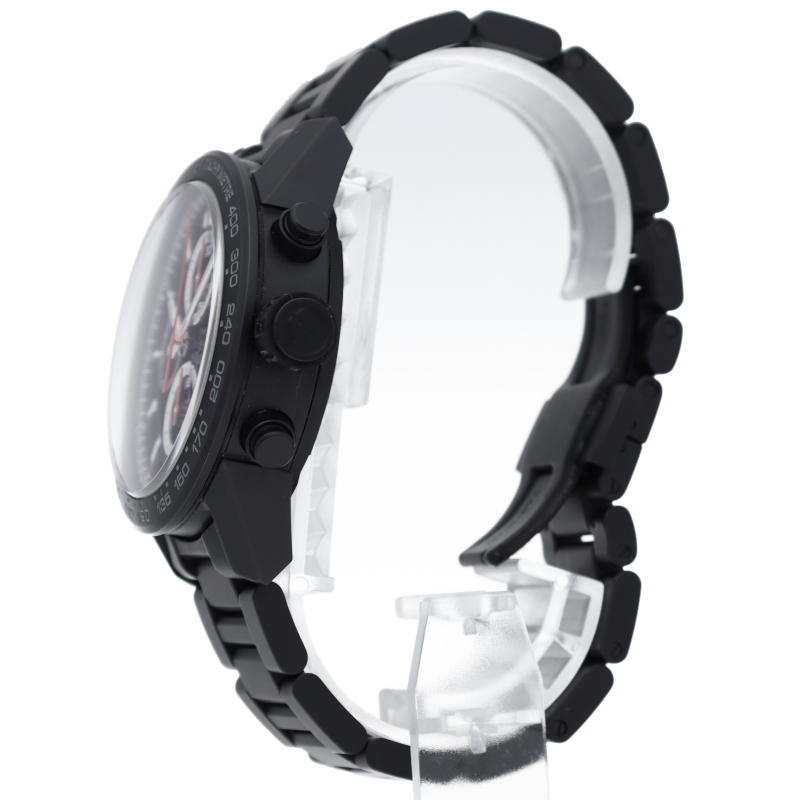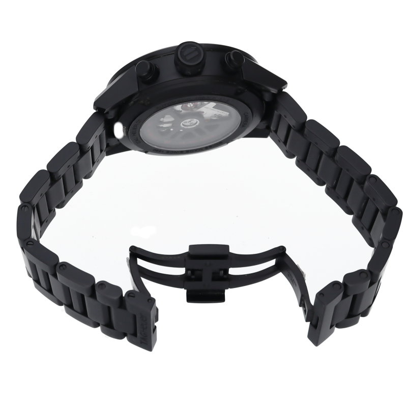 「カレラ キャリバーホイヤー01クロノグラフ」から2mmダウンサイジングした43mmケース。タキメーターベゼルには耐傷性に優れたブラックセラミックを採用し、文字盤をスケルトン仕様にすることでスポーティーでメカニックな印象のモデルです。ムーブメントにはブラックコーティングが施されたローターと赤色のコラムホイールが特徴のキャリバー「ホイヤー01」を搭載します。