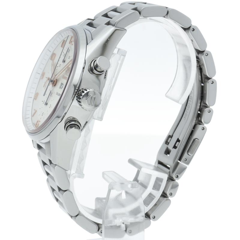 カレラクロノグラフタキメーターのケースと文字盤をベースに曜日表示を加え、カレラタキメーターの防水機能と重厚なブレスレットをもって新たに登場しました。クロノグラフ秒針とスタートボタンには、さり気なくレッドの差し色が施されています。また、サファイヤクリスタルの風防には、両面反射防止コーティングが施され、更に文字盤の視認性が良くなっています。