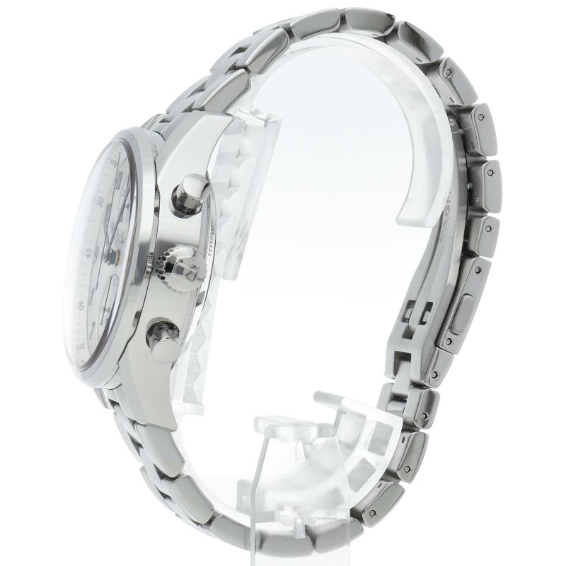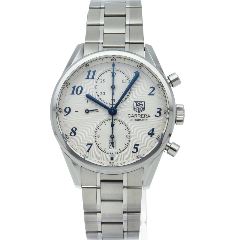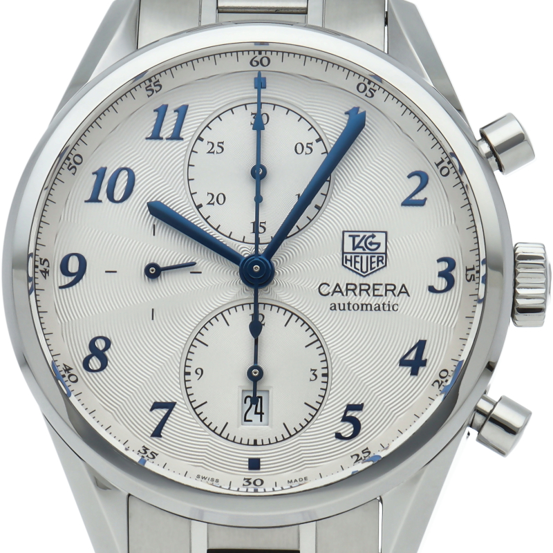 タグ・ホイヤーの中でスポーティとエレガンスを融合したコレクションが「カレラ」。こちらのモデルは12時と6時位置にレコードパターンをあしらった特徴的なインダイヤルを備えます。12時位置は30分計、6時位置は12時間計と日付表示、9時位置はスモールセコンドがセッティング。針、アラビアインデックスがブルースチールとなり、高級感が向上しています。
