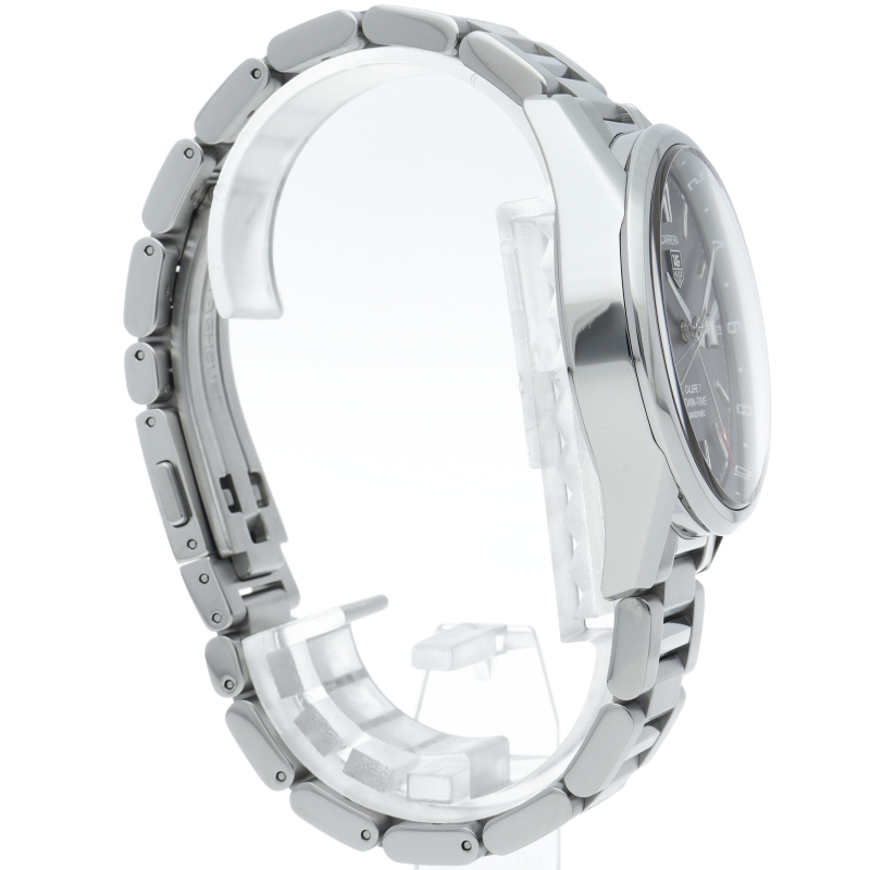 異なる国の時刻が同時にわかる自動巻きキャリバー7ツインタイムを搭載したこのモデルは、ダイヤル外縁の24時間計と先端の赤いGMT針でセカンドタイムゾーンを表示し、ケースバックからムーブメントの精緻な意匠が鑑賞できるのも魅力。男らしい41ミリケース&H型ブレスとダイヤルをオールシルバーでまとめたシンプルなデザインが幅広い装いに映えて使い勝手よく、100m防水と3時位置に日付窓を備えて実用性も抜群です。