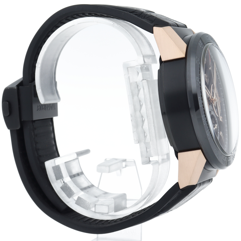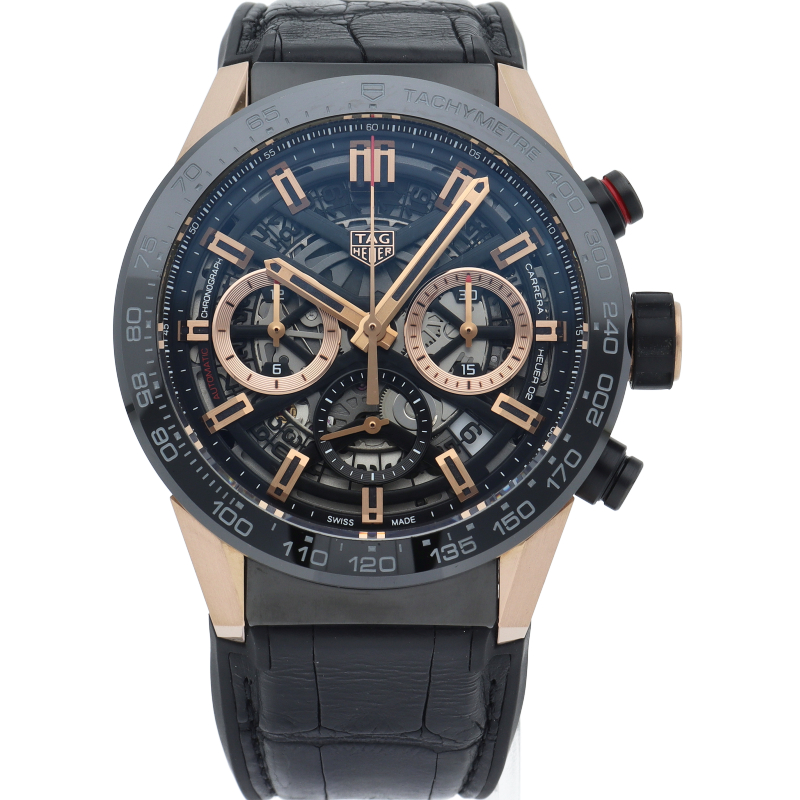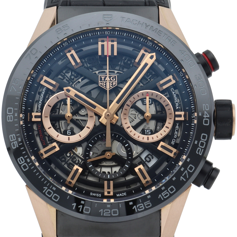 アリゲーター&ラバー製ブラックストラップを備えた、ブラックスティールとローズゴールドが美しいタグ・ホイヤー カレラ ホイヤー02。43mm自動巻クロノグラフに搭載された80時間パワーリザーブ機能付きムーブメントは、サファイアケースバックから眺めることができます。