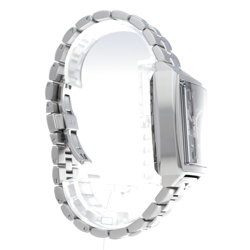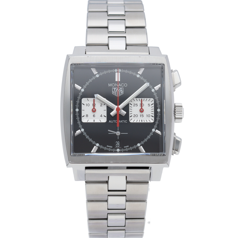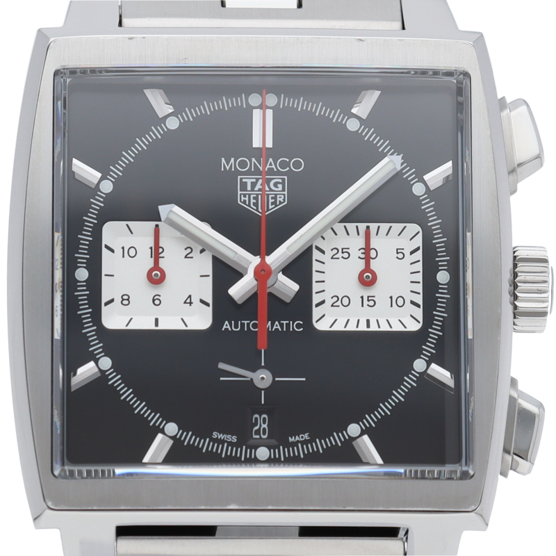 このモナコクロノグラフは、エレガントなブラックサンレイ加工サテン仕上げのダイヤルに39mmスクエアケースにレッドのアクセントが特徴です。自社製ムーブメントキャリバー ホイヤー02も搭載しています。