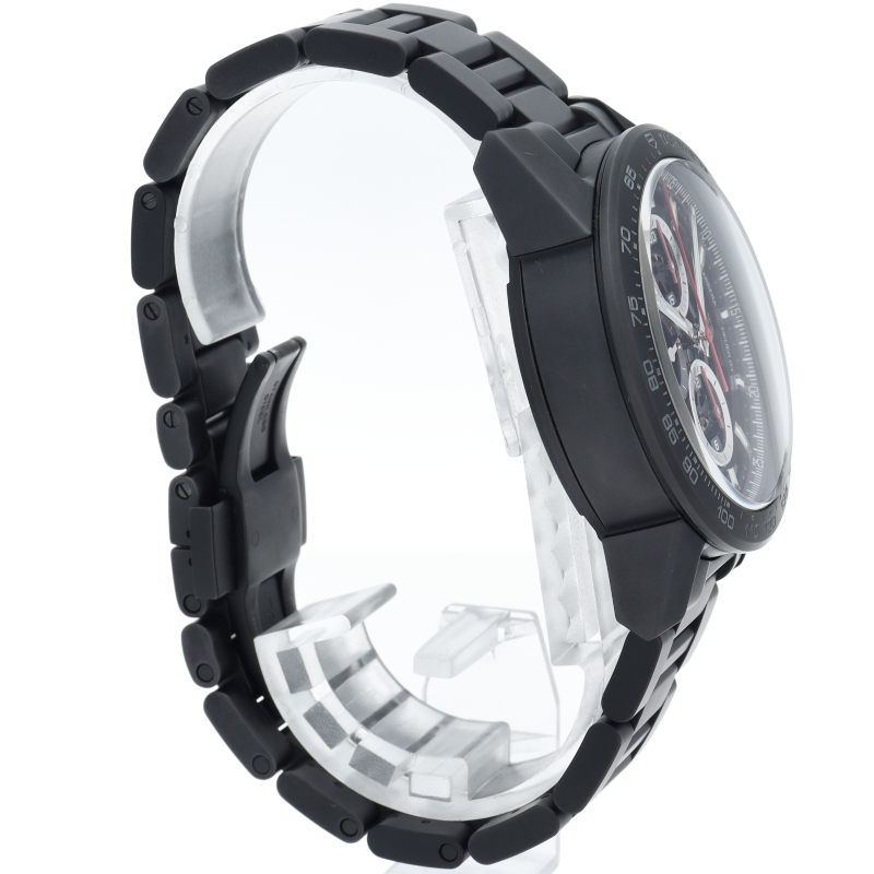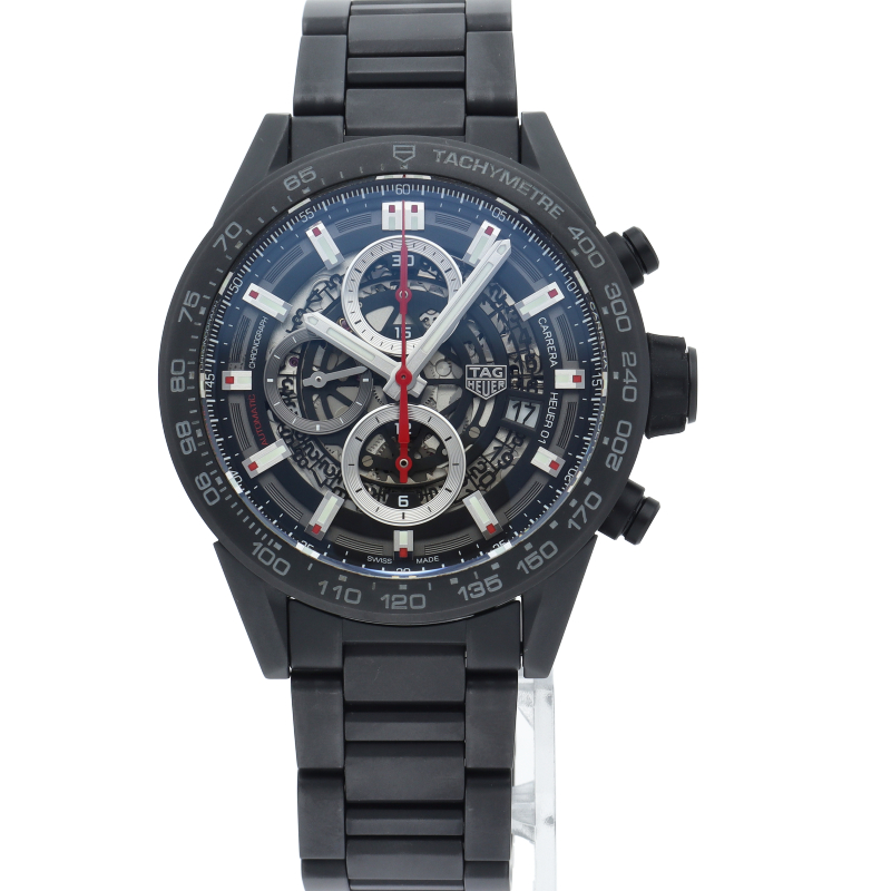 「カレラ キャリバーホイヤー01クロノグラフ」から2mmダウンサイジングした43mmケース。タキメーターベゼルには耐傷性に優れたブラックセラミックを採用し、文字盤をスケルトン仕様にすることでスポーティーでメカニックな印象のモデルです。ムーブメントにはブラックコーティングが施されたローターと赤色のコラムホイールが特徴のキャリバー「ホイヤー01」を搭載します。