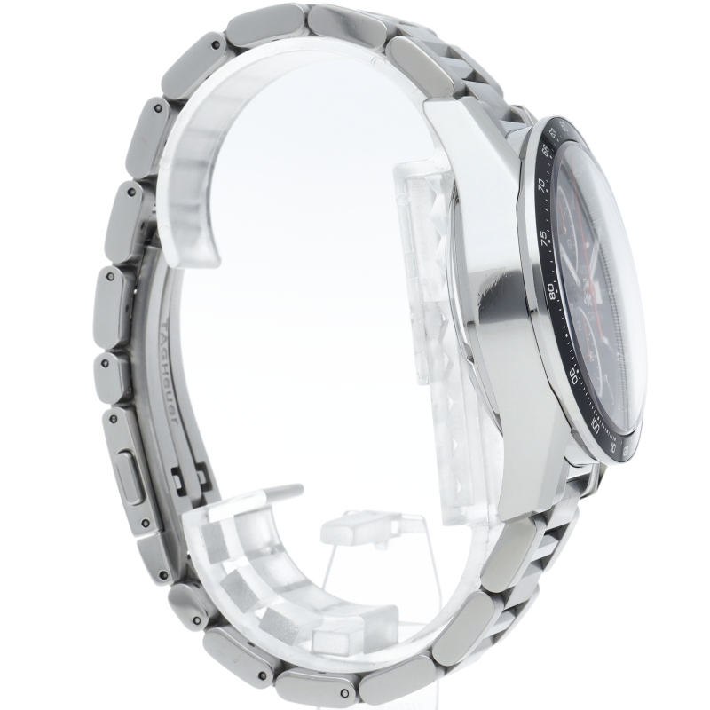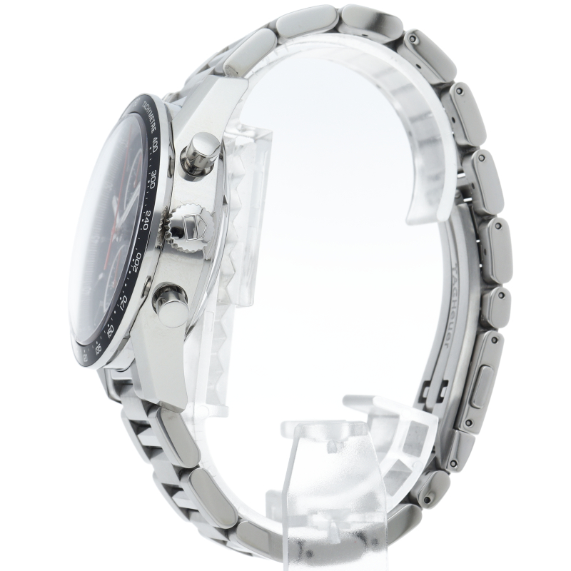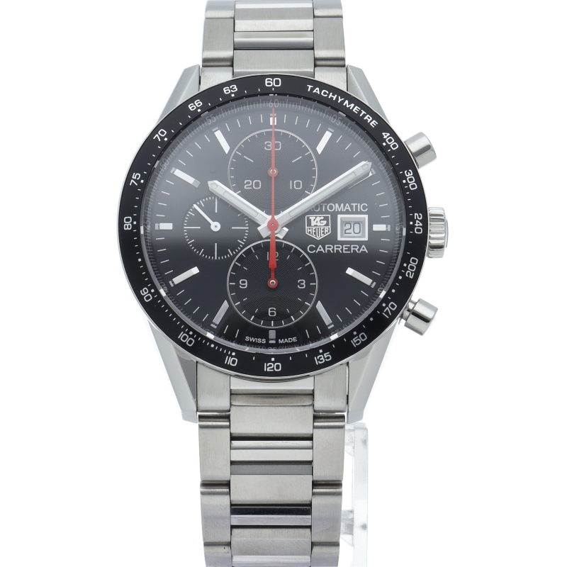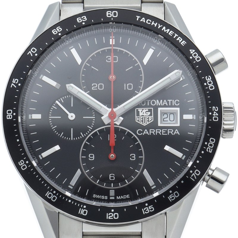 タグホイヤーの人気シリーズ「カレラ タキメーター クロノグラフ」。クロノグラフ機構、デイト表示機能付きでデイリーウォッチに最適です。