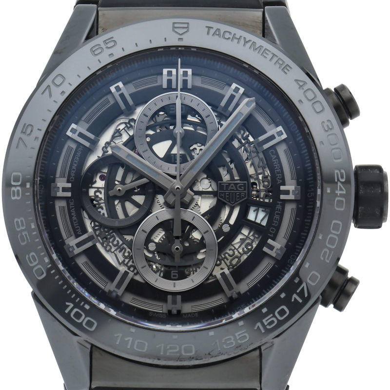 ブランドの創業者のエドワード・ホイヤーへのオマージュとして誕生した「キャリバーホイヤー01クロノグラフ」。キメーターベゼルとケースには耐傷性に優れたポリッシュ仕上げのブラックセラミックを採用。また、文字盤をスケルトン仕様にすることでスポーティーでメカニカルな印象のモデルとなりました。