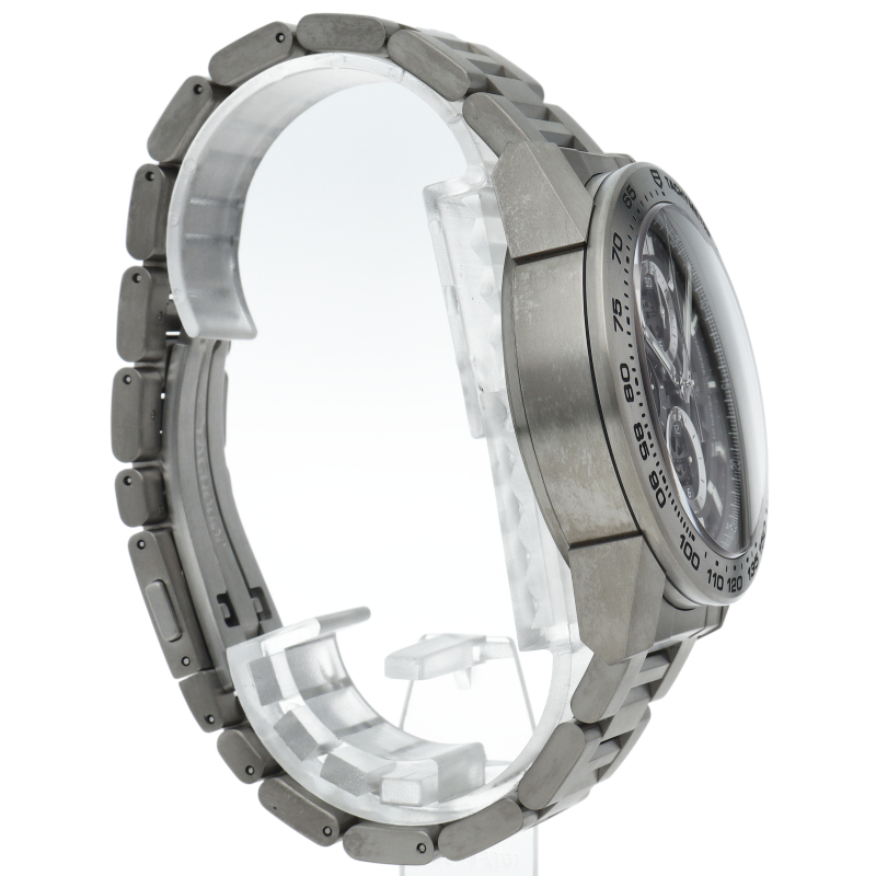 文字盤が全面オープンスタイルとなり、搭載されたタグ・ホイヤー自社製自動巻きクロノグラフ・ムーブメント・キャリバー ホイヤー01が確認できます。グレーファントムと名付けられたこのタイムピースは、あらゆる色調のグレーを用いることで現代的かつ華麗な装いをまとっています。