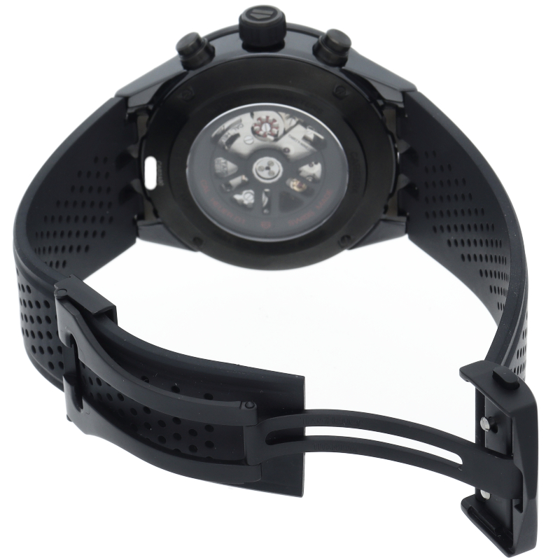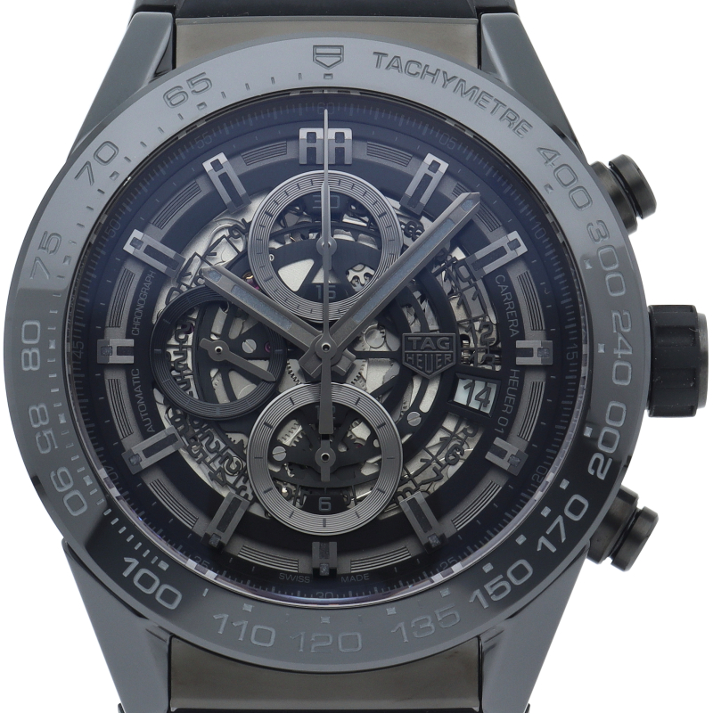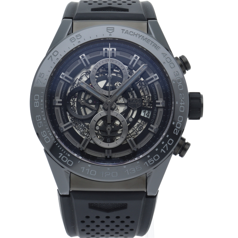 タグ・ホイヤー「カレラ キャリバー ホイヤー01」。マットブラックのセラミックケースとスケルトン文字盤が融合した、フルブラック仕様の圧倒的にクールなクロノグラフです。裏蓋からも自社製ムーブメントの鼓動を堪能可能。生産終了後も中古市場で絶大な人気を誇り、周りと差がつく一生モノとしておすすめの逸品です。