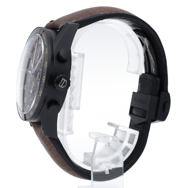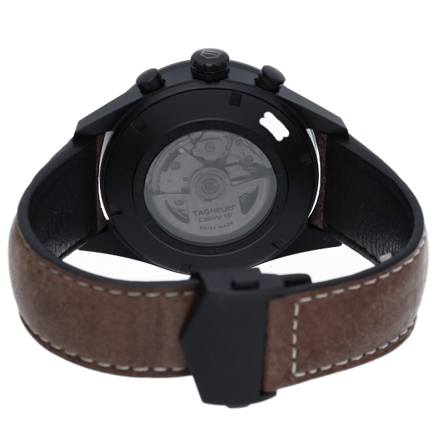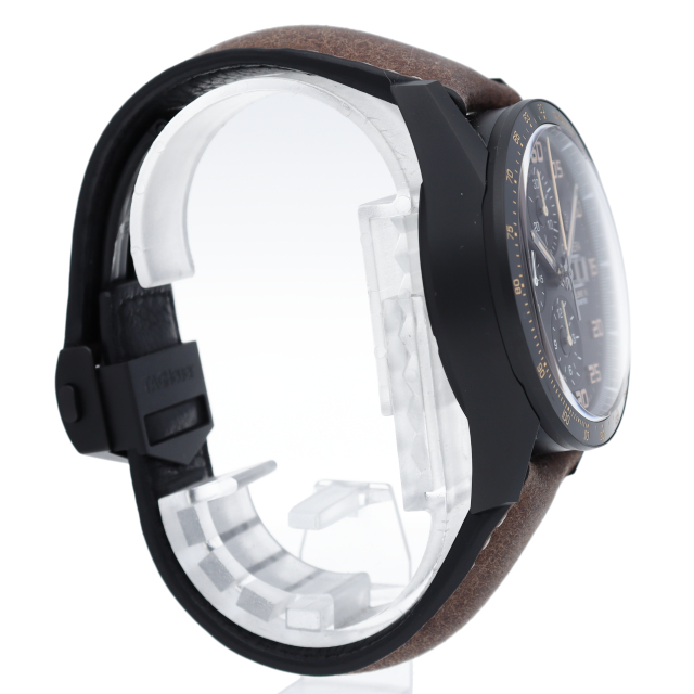 43mmのレーシングからインスピレーションを得たブラックチタン製クロノグラフには、高精度のキャリバー16自動巻ムーブメントが搭載されています。 ダイヤルとセラミック製ベゼルのスタイリッシュなブラックが、カーフレザーストラップの温かみのあるブラウンと絶妙なバランスを取っています。