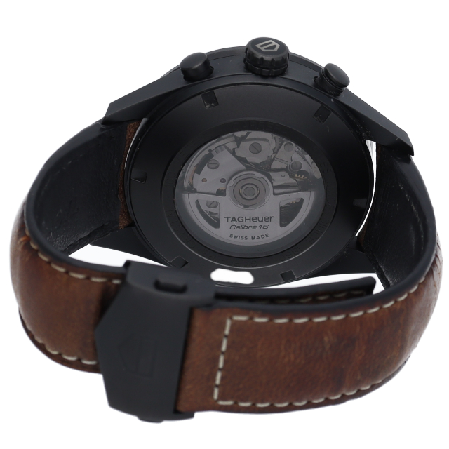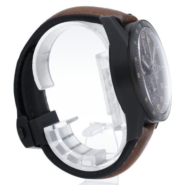 43mmのレーシングからインスピレーションを得たブラックチタン製クロノグラフには、高精度のキャリバー16自動巻ムーブメントが搭載されています。 ダイヤルとセラミック製ベゼルのスタイリッシュなブラックが、カーフレザーストラップの温かみのあるブラウンと絶妙なバランスを取っています。